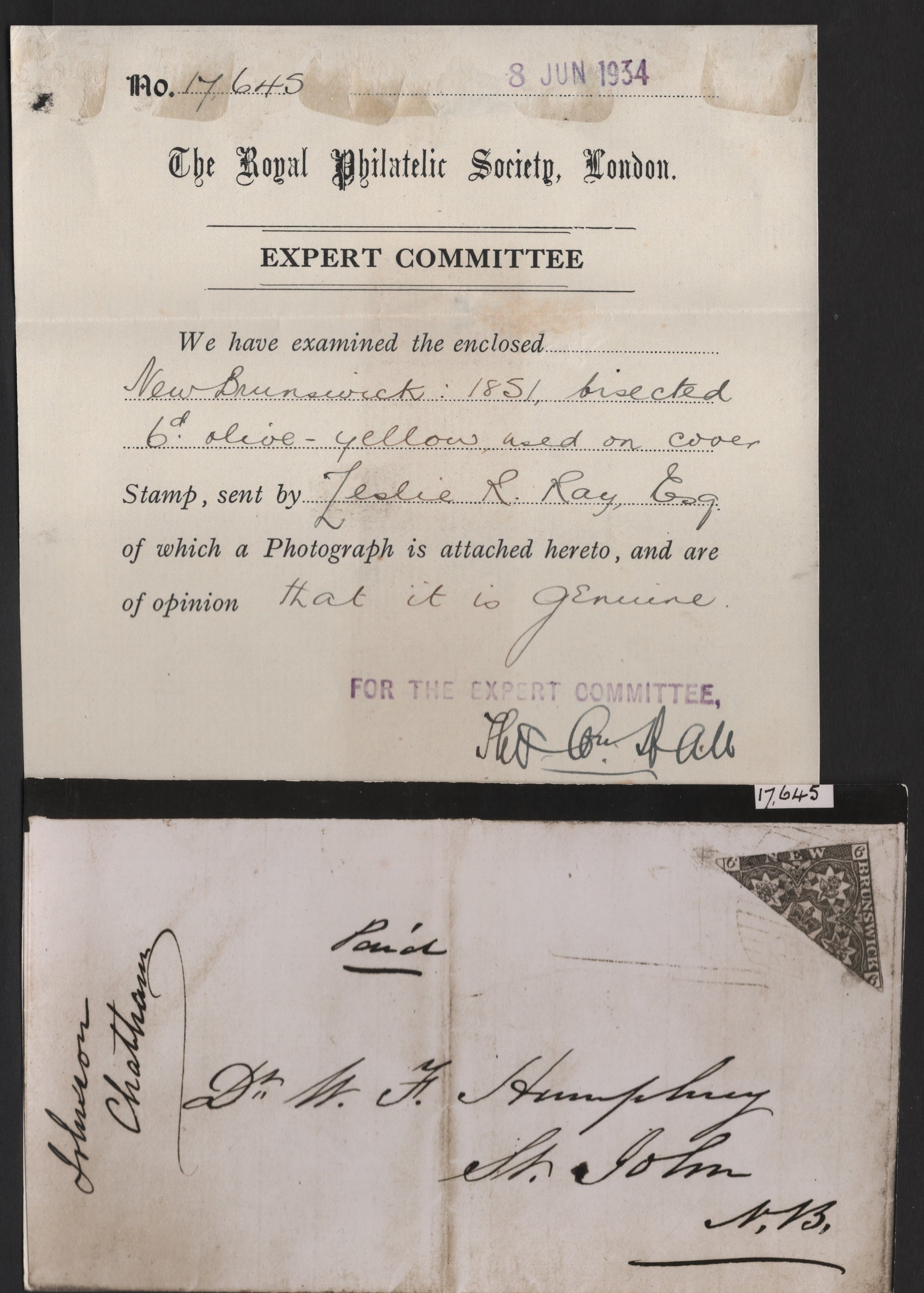 A fine cover of the 6d mustard yellow Crown & Heraldic Flowers from the 1851-1860 Pence Issue franked with bisected single, tied by faint #8 Chatham grid cancel, one of two known, this is the earliest, from February 1859, 1994 BPA certificate. The cover is a folded letter sheet with the usual vertical file fold, but is otherwise fresh and pristine. The stamp has the right margin just clear to just touching at upper right, while the top margin is just clear at upper right and just in at upper left, so the stamp is VG, but this is of little consequence on a cover of this rarity. The BPA certificate identifies the shade as olive yellow, but comparing the stamp to all the other olive yellow #3's I have in this sale leads me to conclude that this is incorrect, and the stamp is in fact the mustard yellow shade, which on cover, commands a 25% premium over the normal olive yellow. According to the consignor this is one of only 2 known bisect covers from Chatham to Saint John, and this one is the earliest, having been sent February 8, 1859 and arriving in Saint John On February 11. A second, 1934 Royal Philatelic Society certificate accompanies and also identified this as the 6d olive yellow, but I think that is because the mustard yellow shade was not listed in 1934.