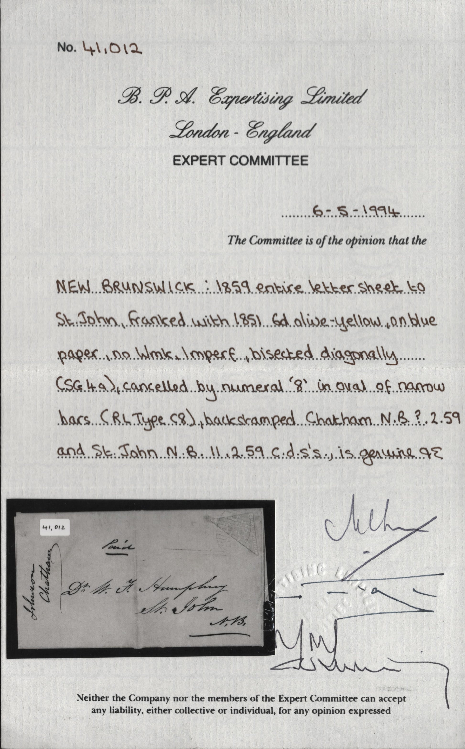 Lot 317 (C) New Brunswick #2bvar 6d Mustard Yellow Crown & Heraldic Flowers, Pence Issue, A Fine Cover Franked With Bisected Single, Tied By Faint #8 Chatham Grid Cancel, One Of Two Known, This Is The Earliest, From February 1859, 1994 BPA Certificate