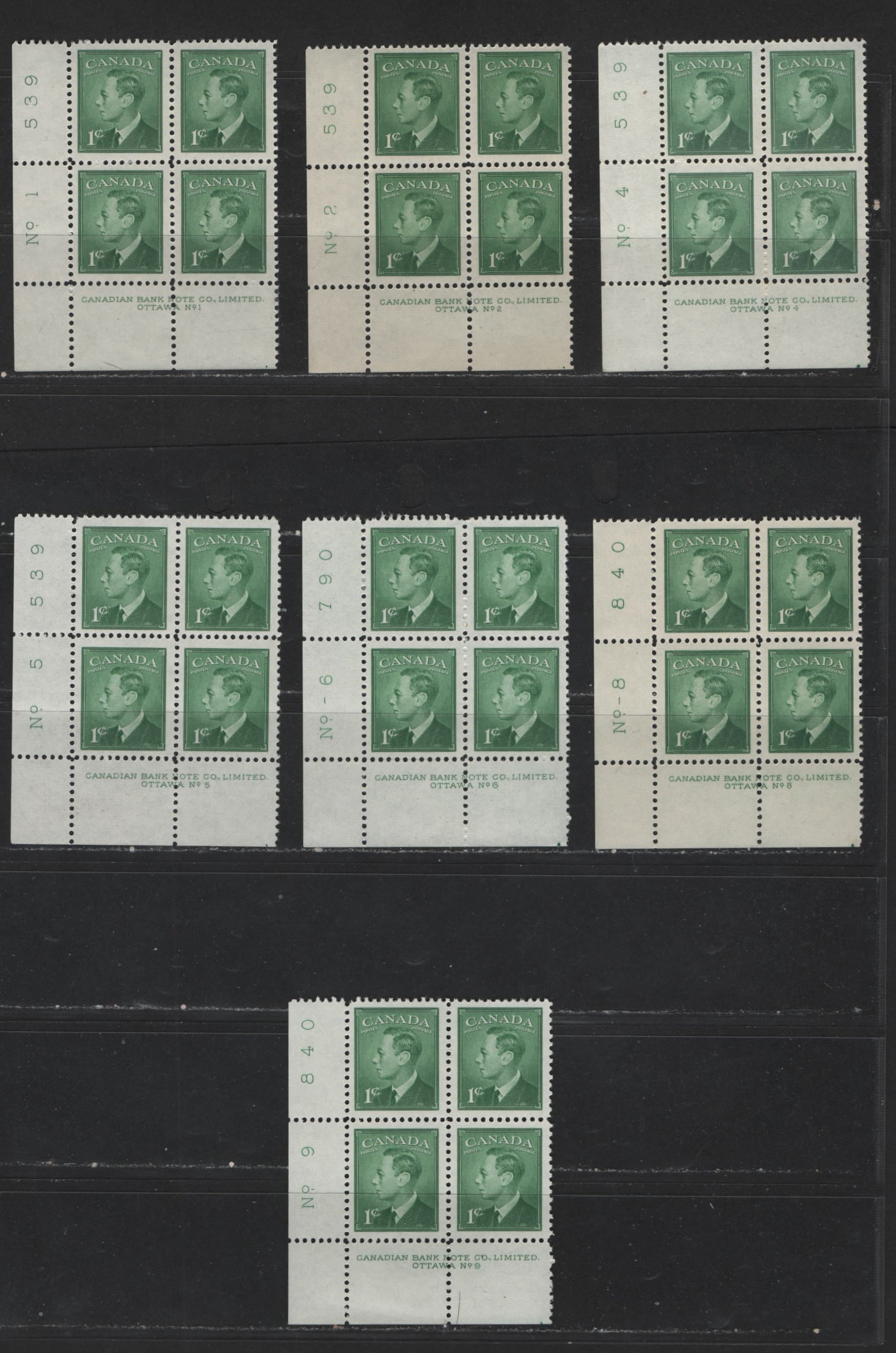 Lot 118 (C) Canada #284 1c Green King George VI, 1949-1952 Postes-Postage Issue, VFNH UL Plate Blocks Plates 1-2, 4-6, 8-9