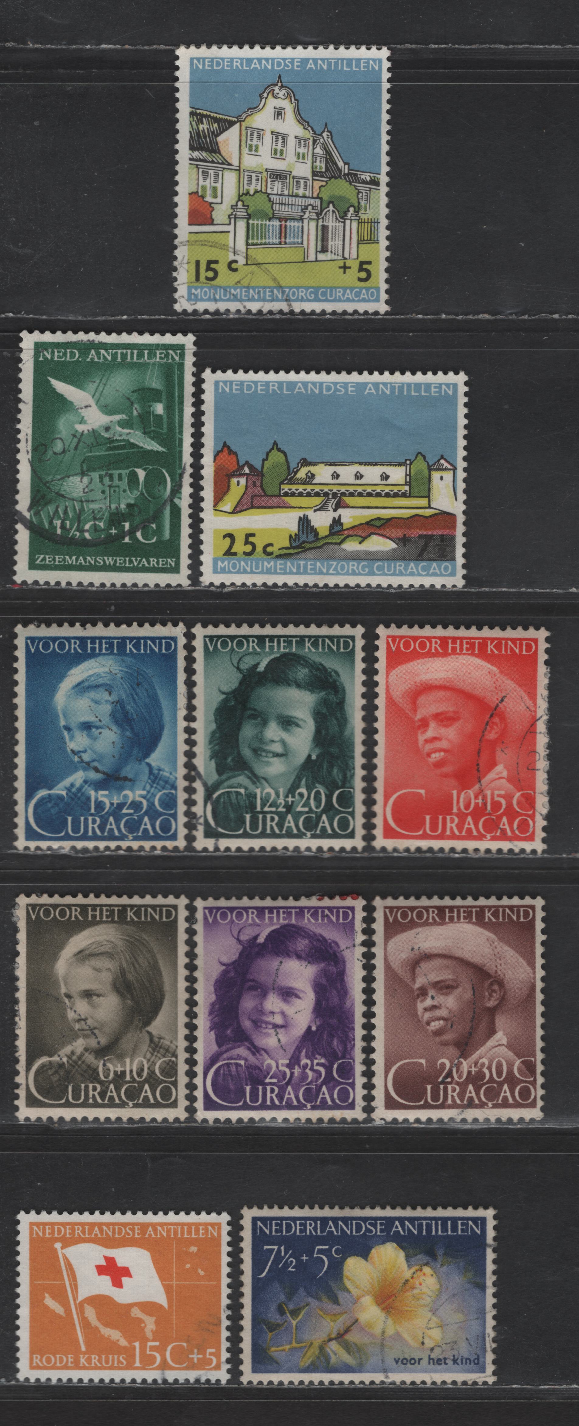 Lot 357 Netherlands Antilles SC#B4-B9, B15, B22, B45, B47, B41 6c+10c - 25c+7.5c Olive Brown - Multicolored Curacao Children - Community House, 1948-1959 Semi Postal Issues, 11 Fine/Very Fine Used Singles