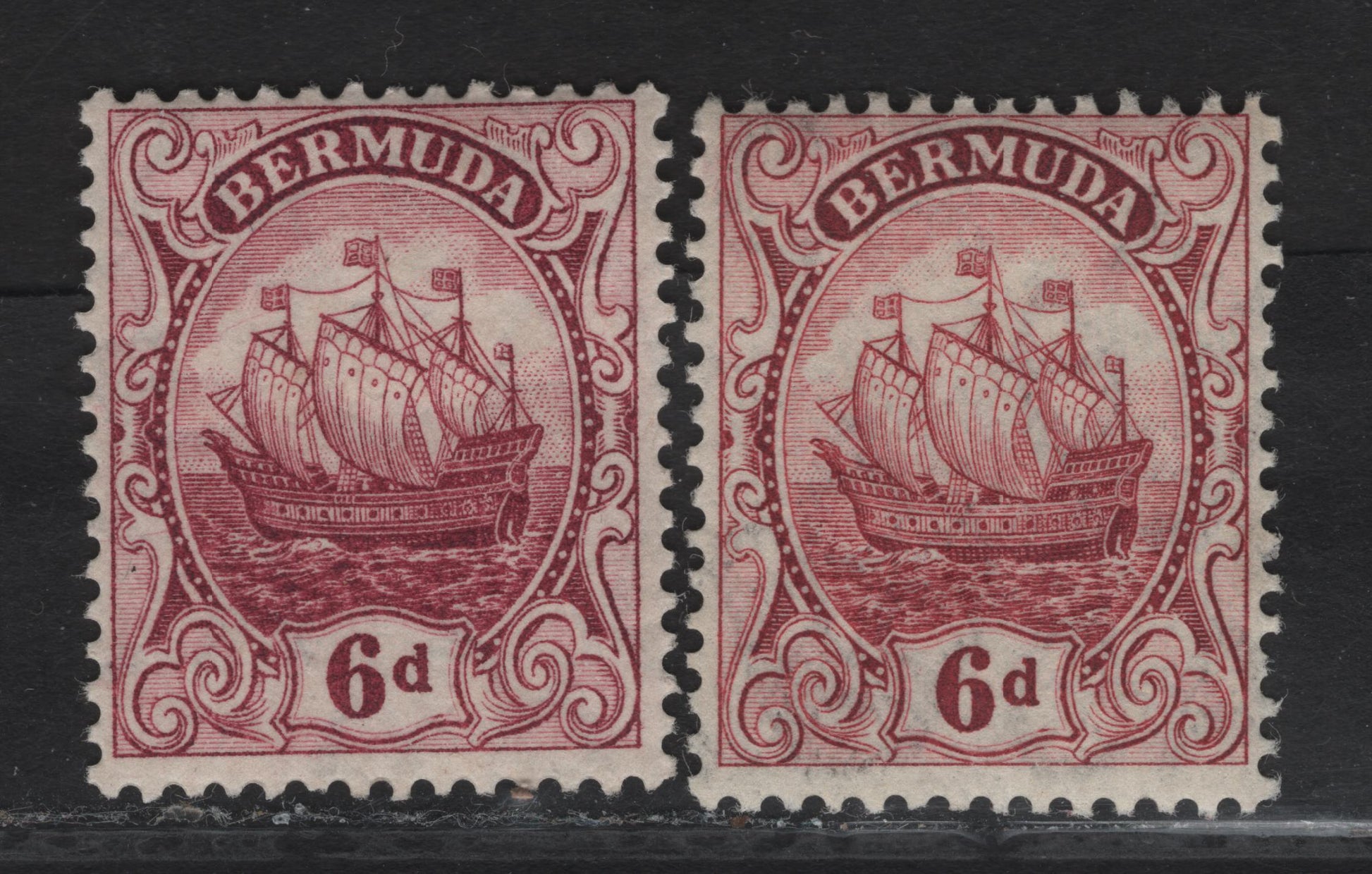 Lot 36 Bermuda SG#50-a 6d Purple - Pale Claret Caravel, 1910-1925 Caravel Definitives, 2 FOG Singles, Multiple Crown CA Wmk, Comb Perf 14