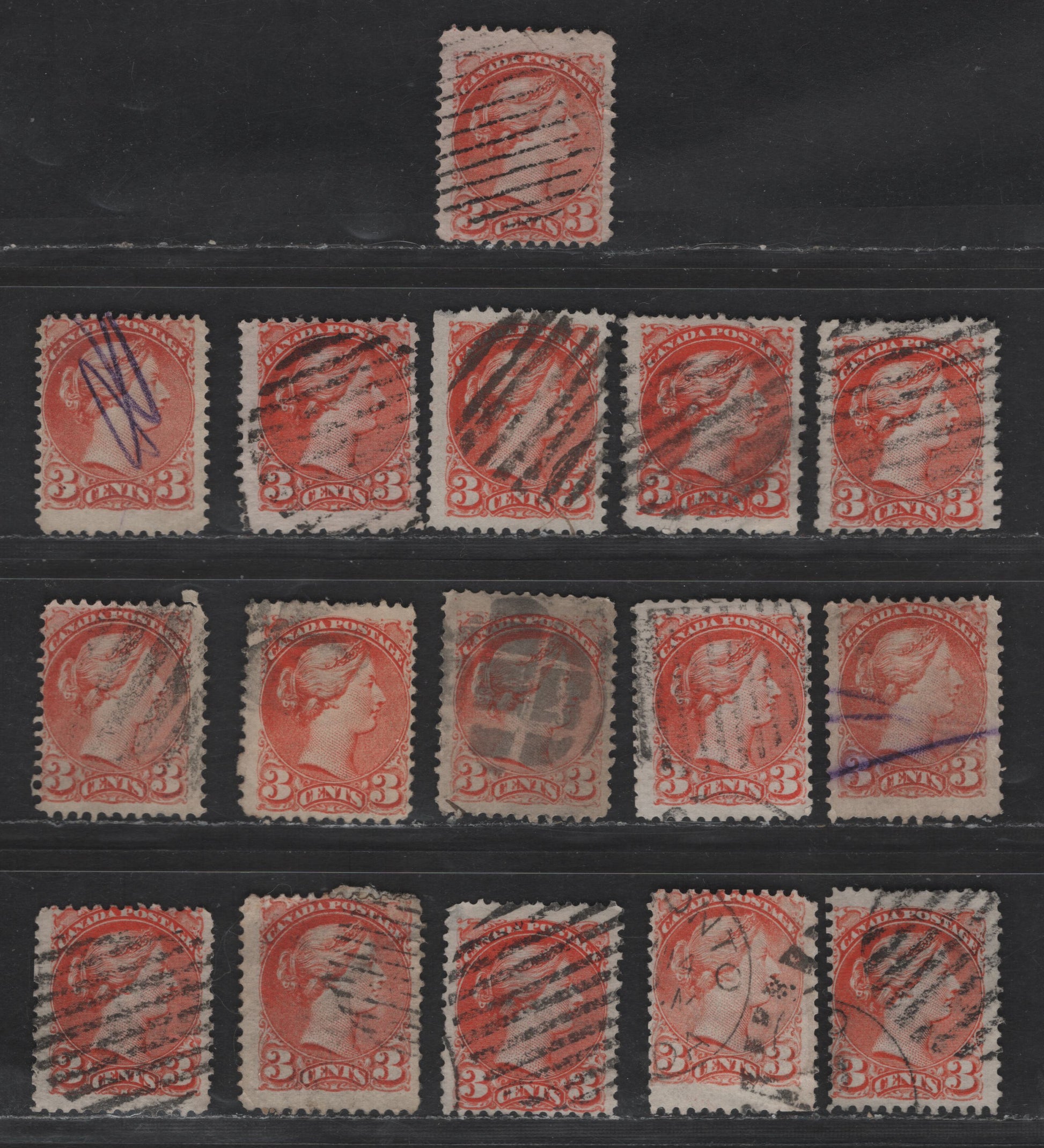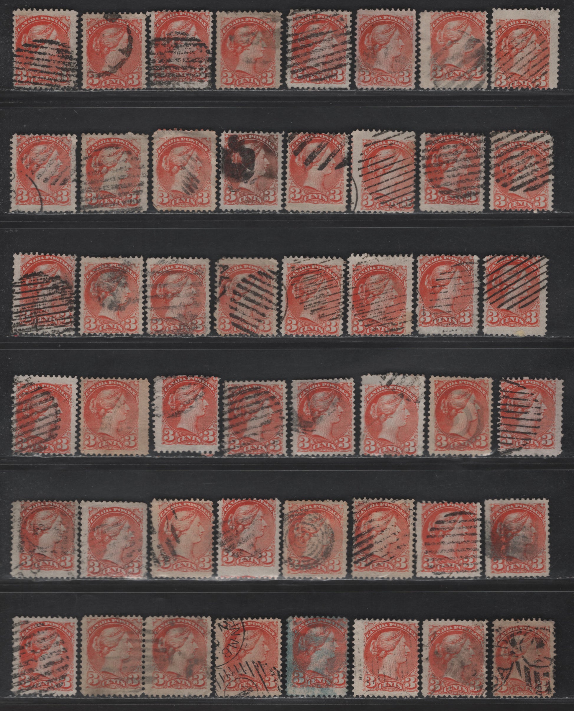 Lot 384 Canada SC#37 3c Red Orange, Bright Red Orange & Orange Queen Victoria, 1870-1893 Small Queen Issue, 60 Ungraded Singles, Mid to Late Montreal Printings, Various Papers, Perf 12, No Pos. Dots