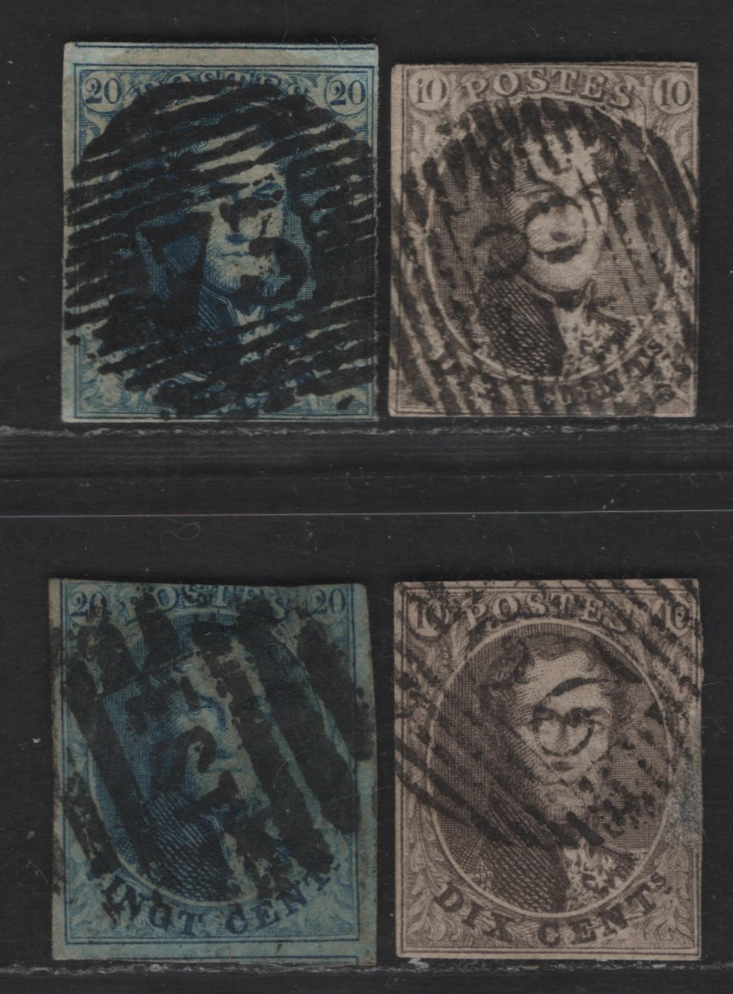 Lot 4 Belgium SC#6-7, 6b-7b 10c - 20c Brown - Blue Leopold I, 1851-1854 Leopold I Issue, 4 Ungraded Singles, Both Values On Thick & Medium Path Faults, Useful For Reference