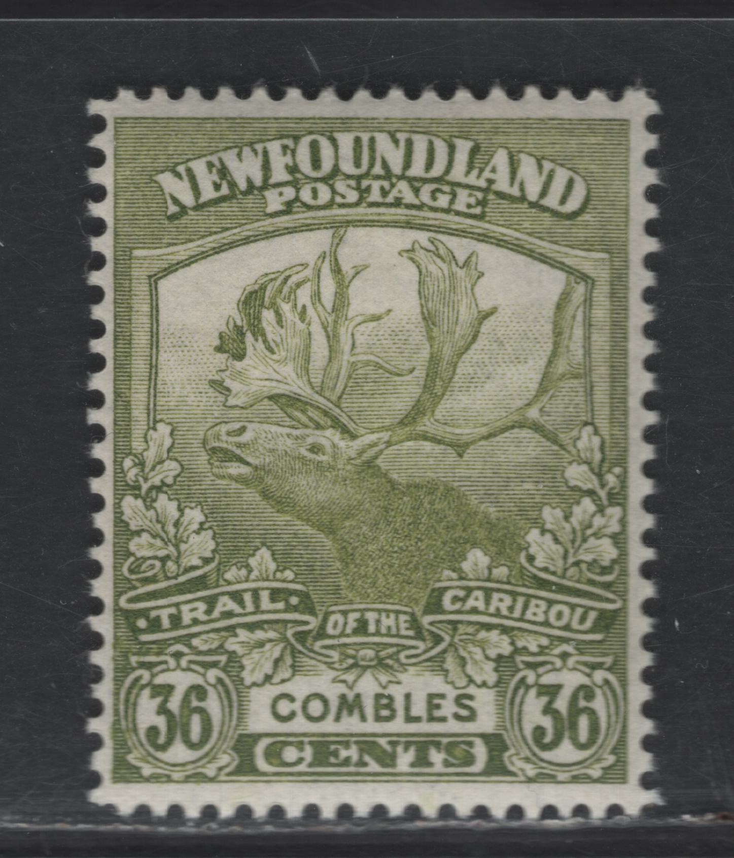 Lot 41 Newfoundland #126 36c Olive Green Combles, 1919 Trail of the Caribou Issue, A VFOG Single, Perf 14.1x14