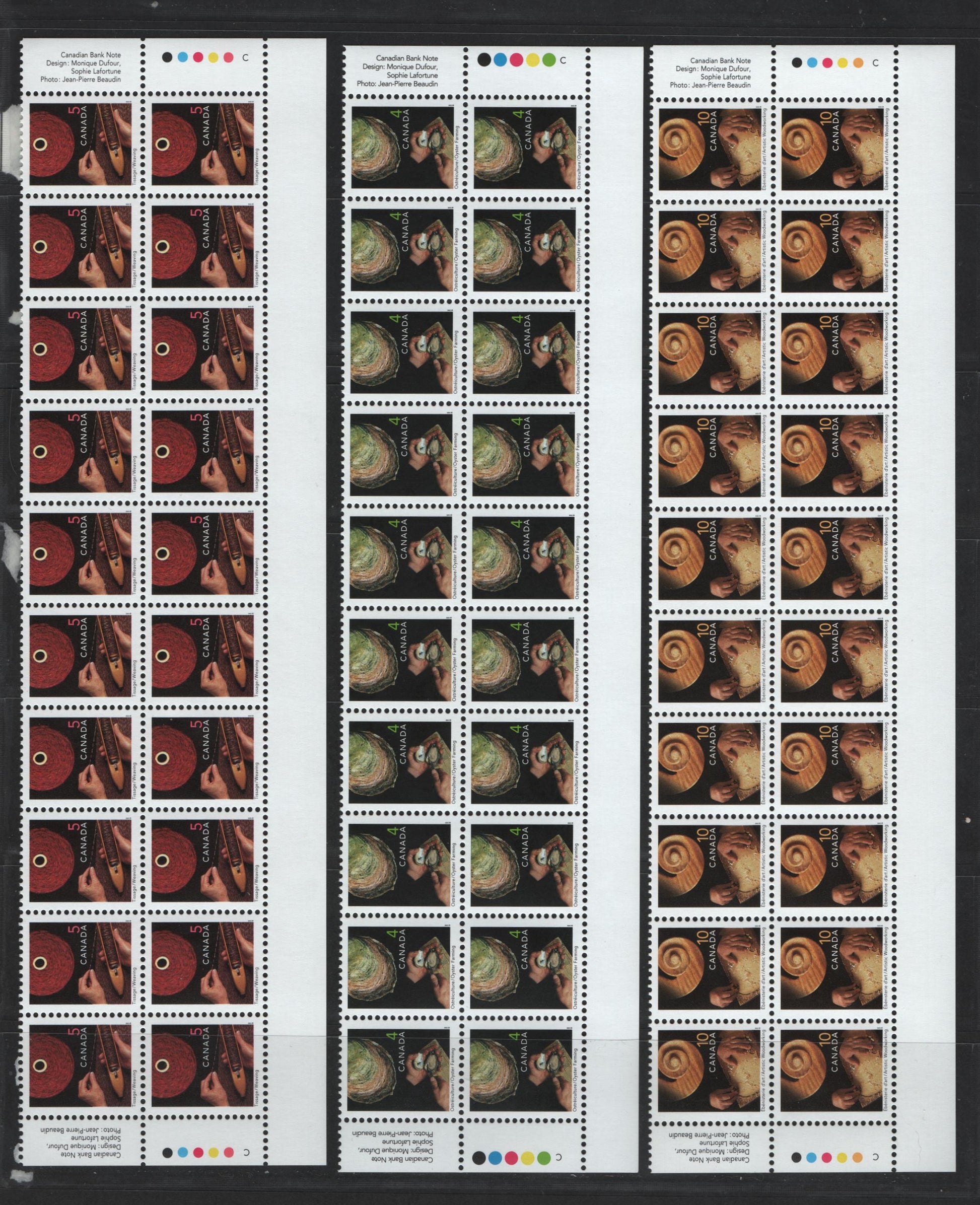 Lot 142 Canada #1676ivar, 1677ivar, 1679ivar 4c, 5c, 10c Oyster Farming - Woodworking, 1999-2007 Traditional Trades Definitives, 3 VFNH Bottom Inscription Blocks Of 20 Early 2001 CBN Reprints, With Imperforate Bottom Selvedge, And No Barcode, Unlisted