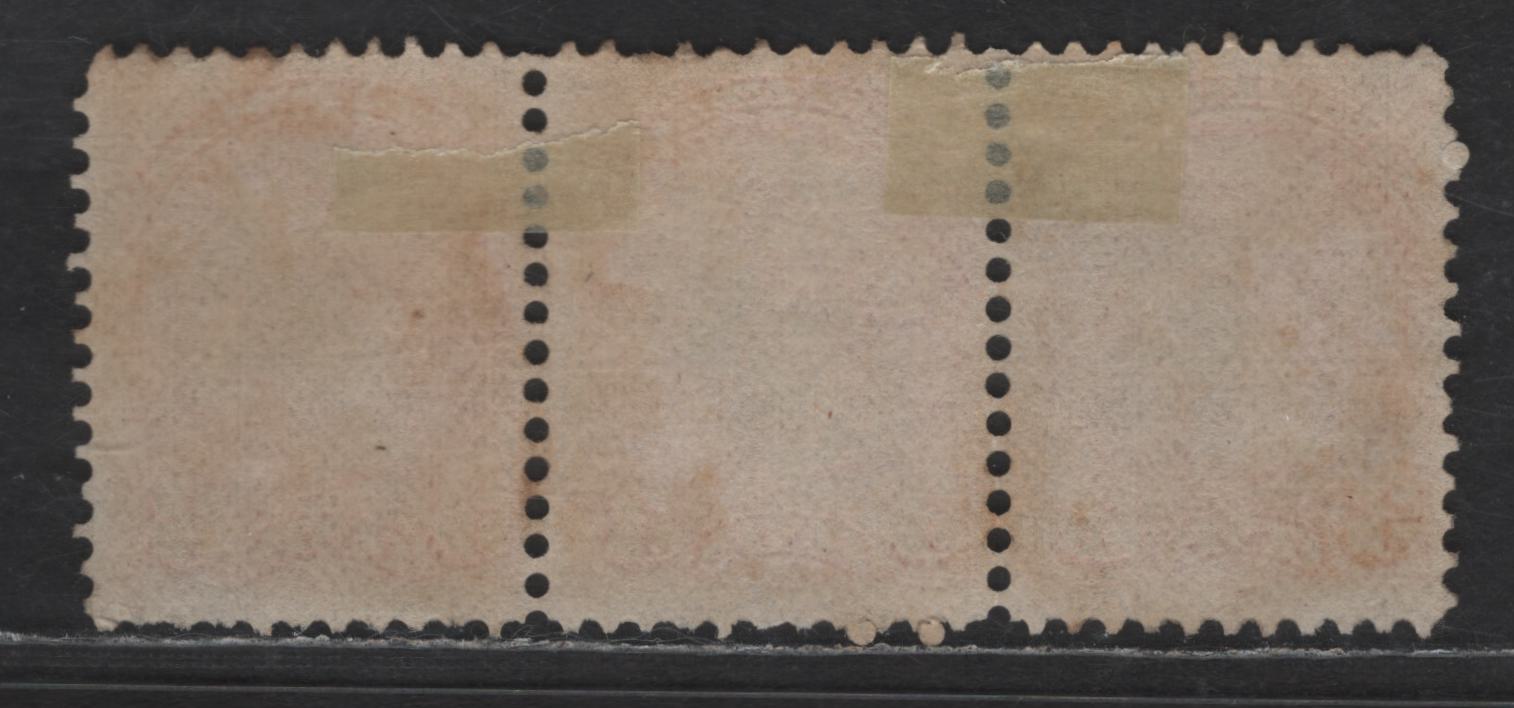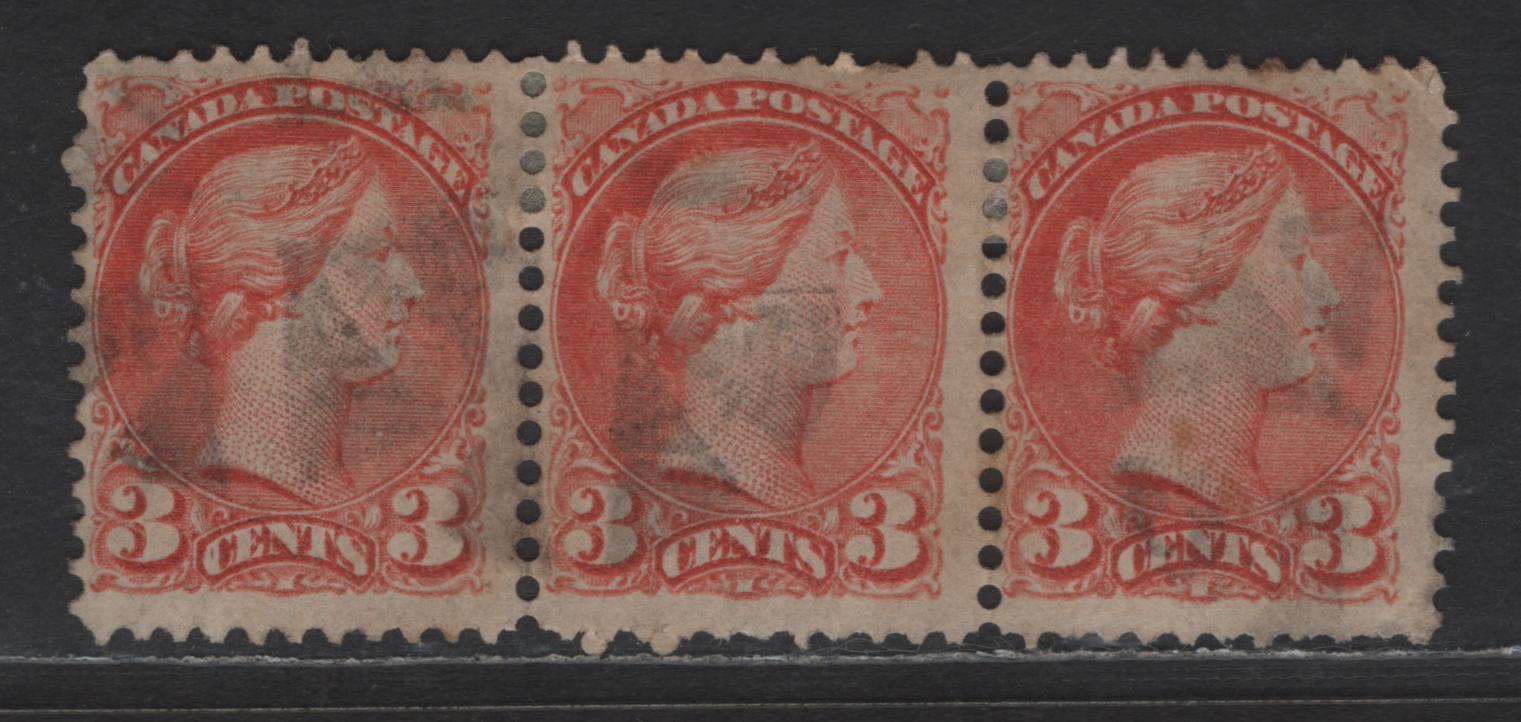 Lot 439 Canada SC#37 3c Red Orange Queen Victoria, 1870-1893 Small Queen Issue, A Very Good/Fine Used Strip Of 3, Late Montreal Printing, Paper LM-R, No Pos. Dots Or Medallion Dots, Perf 12x12.1