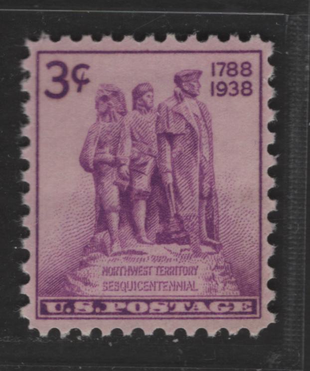 A XF-SUP NH single of the 3c bright rose purple Colonization Of The West from the 1938 Northwest Territory Sesquicentennial . Very close to perfect centering. With the unaided eye, one has to look very closely to notice that it is not quite perfectly centered, and by this it is generally meant that no side will be more than about 1/8th to 1/4 of a milimeter larger than any of the other sides. We're talking a difference so small that even with very close scrutiny the stamp looks more or less perfect, and it is only after some time that you begin to get the sense it is not quite perfect.