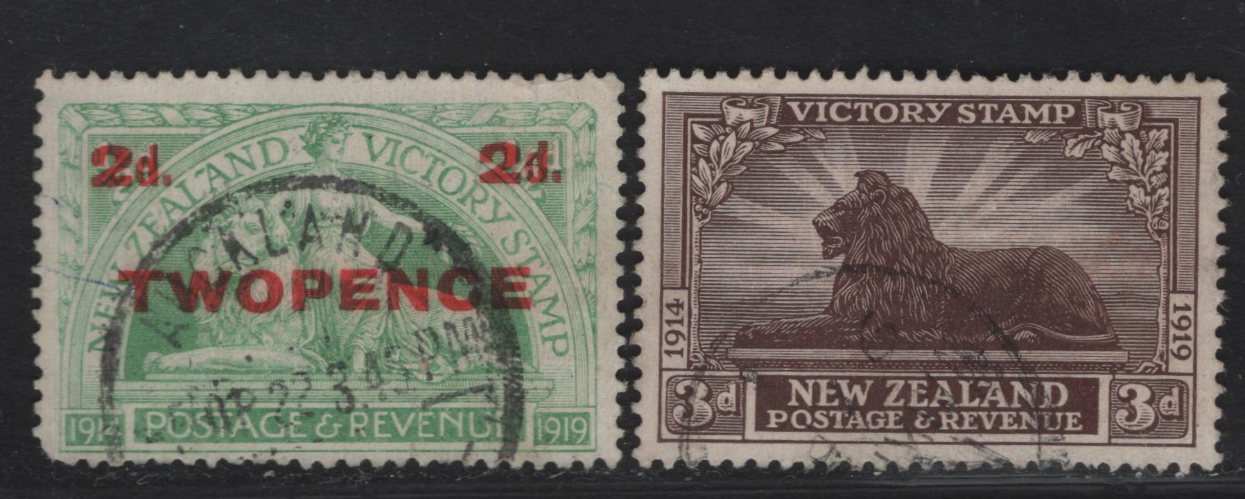 Lot 48 (C) New Zealand SG#456, 459 3d - 2d on 1.5d Chocolate - Green Native - New Zealand, 1920 Victory Issue, 2 Very Fine Used Singles
