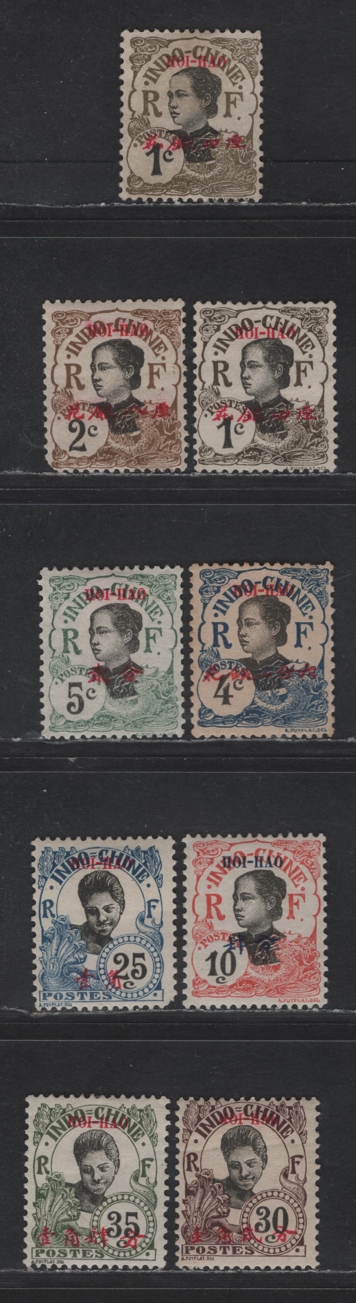 Lot 49 French Offices Abroad - China (Hoi Hao) SC#49-53, 56-58 1c - 35c Olive Brown & Black - Brown & Black Annamite Girl & Cambodian Girl, 1908 Surcharged Issue, 8 Fine/Very Fine Unused & OG Singles