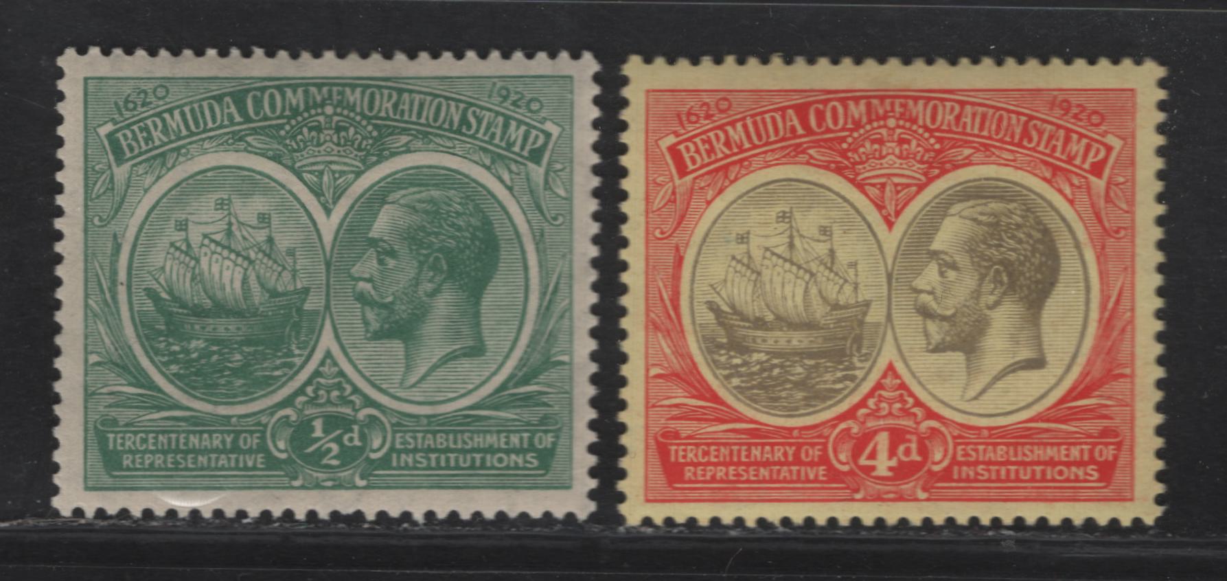 Lot 49 Bermuda SG#60, 63 1/2d - 4d Green - Gray & Red on Yellow King George V & Ship, 1920-1921 Tercentenary of Representative Institutions, 2 VFOG Singles