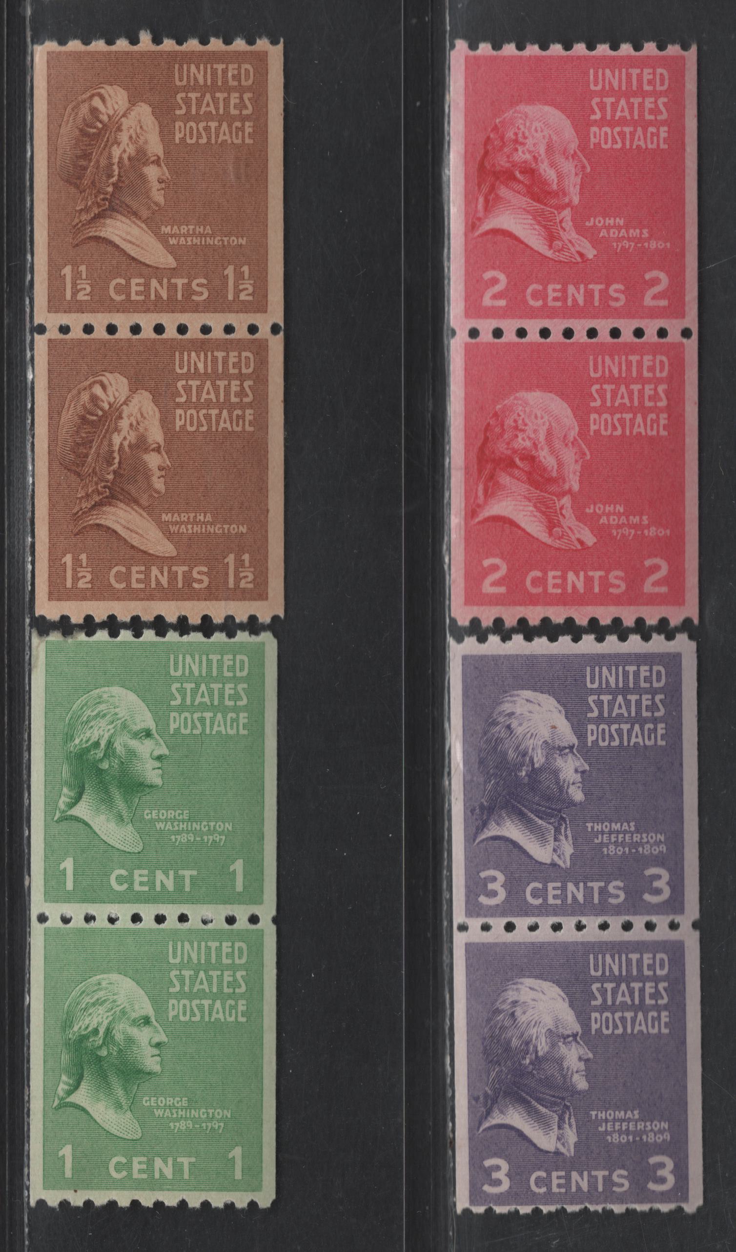 Lot 498 United States SC#848-851 1c -3c Green - Light Violet George Washington - Thomas Jefferson, 1939-1954 Presidential Issue, 4 VFNH Coil Pairs, Perf 10 Horizontal, Light Fingerprint On Gum Of1.5c & 3c, Small Gum Disturbances On 1c Pair