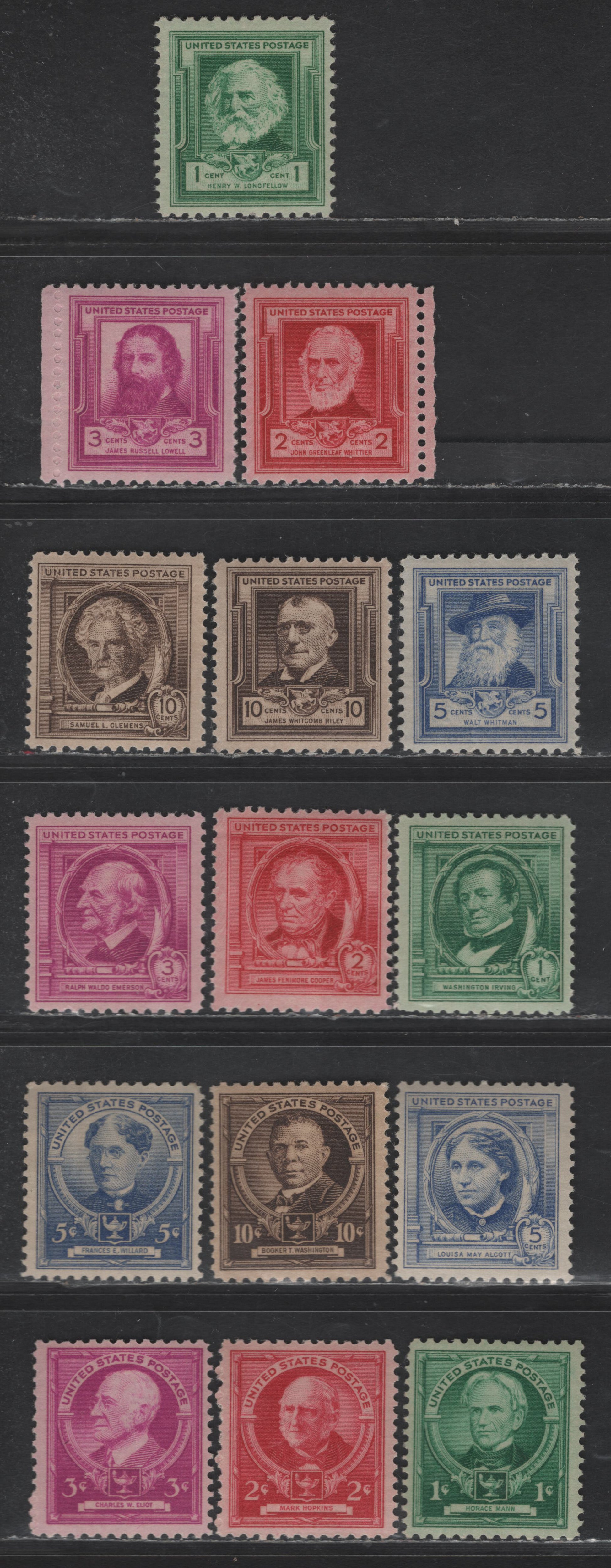 Lot 499 United States SC#859-873 1c - 10c Bright Blue Green -Dark brown Washington Irving - Booker T Washington, 1940 Famous Americans Issue, 15 F/VFNH Singles