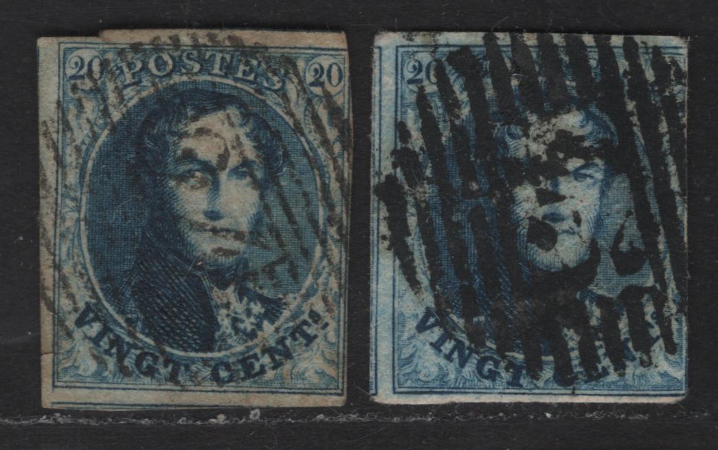 Lot 5 Belgium SC#7, 7b 20c Blue & Deep Blue Leopold I, 1851-1854 Leopold I Issue, 2 Fine Used Imperf Singles, Thick & Medium Paper, Two 3 Margin, Sound Examples, Two L's Without Frame Wmk