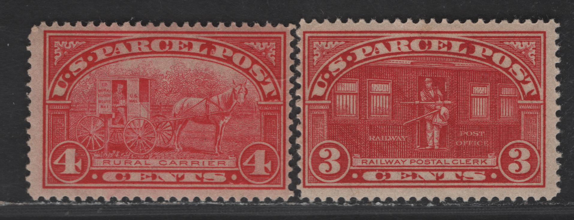 Lot 520 United States SC#Q3-Q4 3c - 4c Carmine - Carmine Rose Railway Postal Clerk - Rural Carrier, 1913 Parcel Post Issue, 2 FOG Singles, Single Lined USPS Wmk