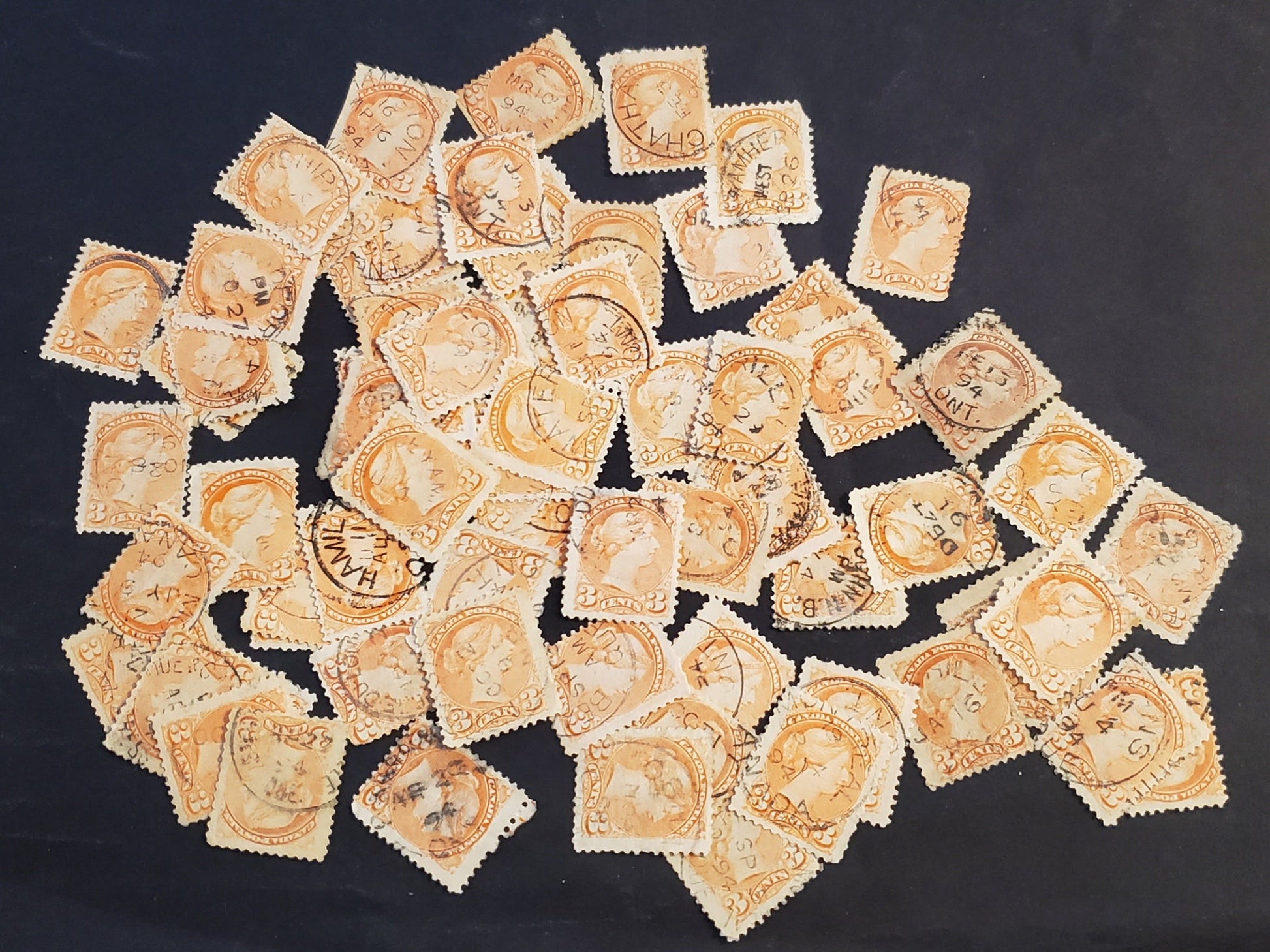 Lot 53 Canada #41 3c Vermillion - Orange Vermillion Queen Victoria, 1888-1897 Small Queen Issue, 69 Ungraded Singles, Faulty Examples, 1894 Dated Cancels, Good Reference Material To Sort Using My Tables.