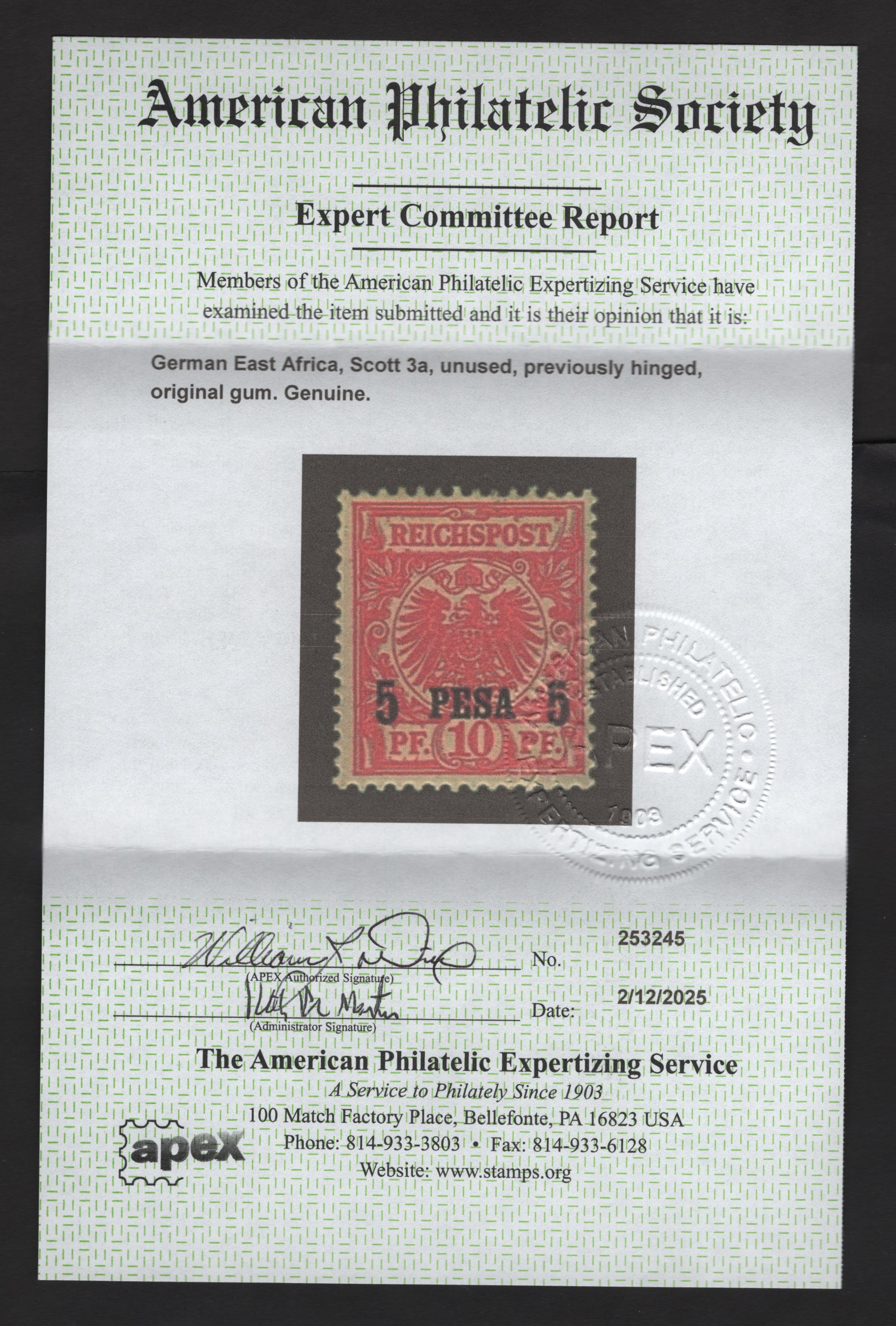 Lot 54 German East Africa SC#3a 5pes on 10pf Carmine Coat of Arms, 1893 Surcharged Issue, A VFOG Single, Surcharge 14.25mm Long With Clear 2025 APS Certificate
