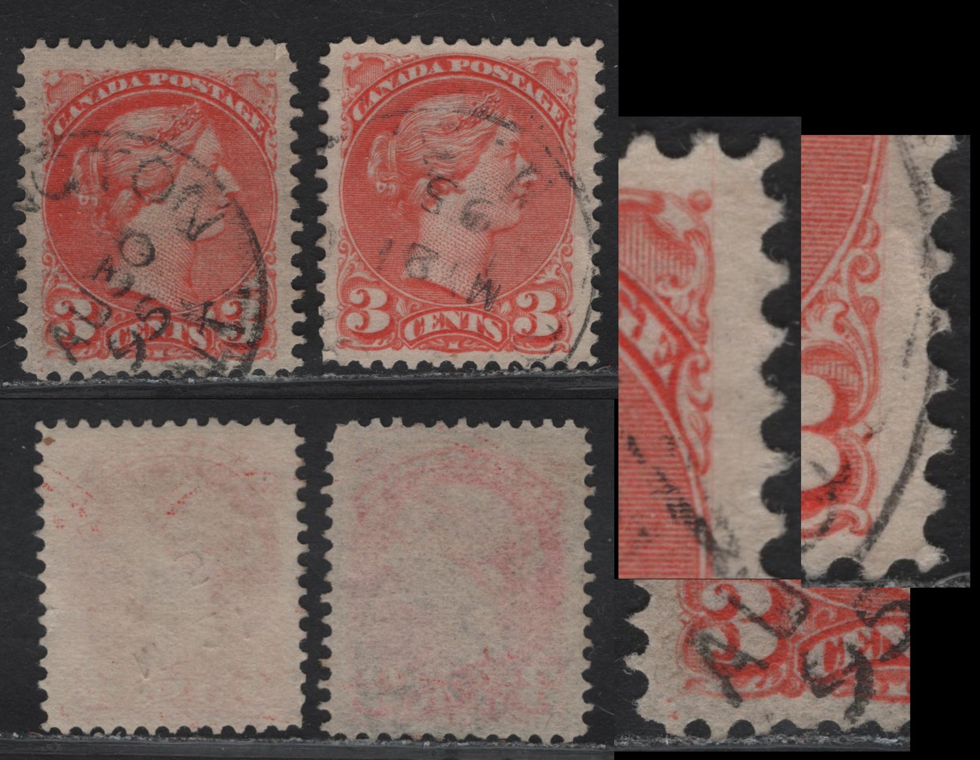 Lot 56 Canada #41 3c Light Orange Vermillion Queen Victoria, 1888-1897 Small Queen Issue, 2 Very Fine Used Singles, Mid Second Ottawa Printings, Papers 2O-KK & 2O-E, Showing Two Faint Corner Position Dots At LL.