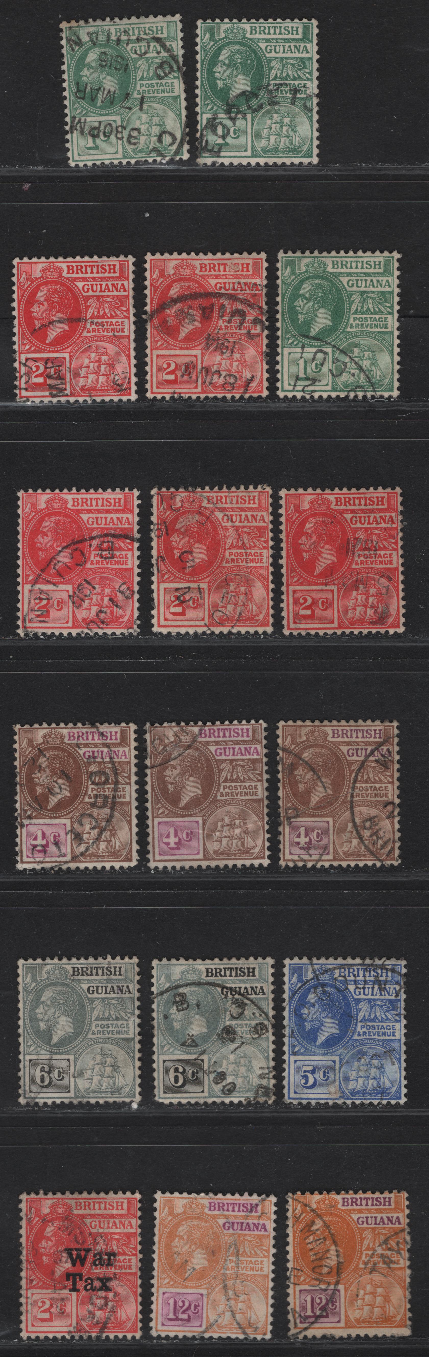 Lot 56 (C) British Guiana SG#259-a, 260-a, 261, b, 262-264, 271 1d - 12c Yellow Green - Orange & Violet King George V, 1913-1921 KGV Colonial Badge Keyplate, 10 Fine/Very Fine Used Singles, Multiple Crown CA Wmk, Listed & Unlisted Shade Varieties