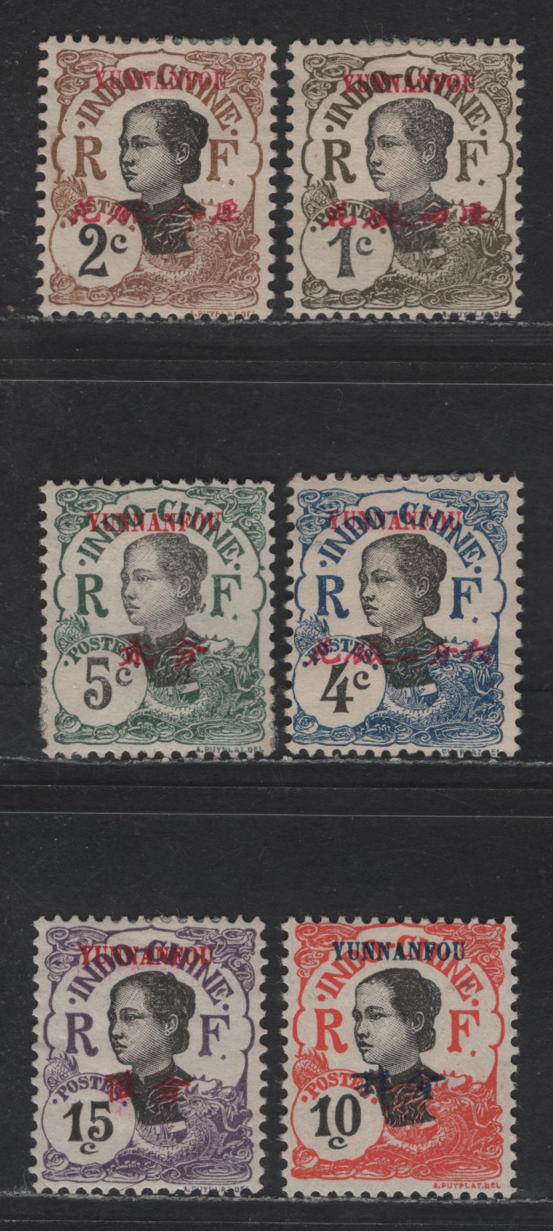 Lot 58 French Offices Abroad - China (Yunnan Fou) SC#34-39 1c - 15c Olive Brown & Black - Violet & Black Annamite Girl & Cambodian Girl, 1908 Surcharged Issue, 6 F/VFOG Singles