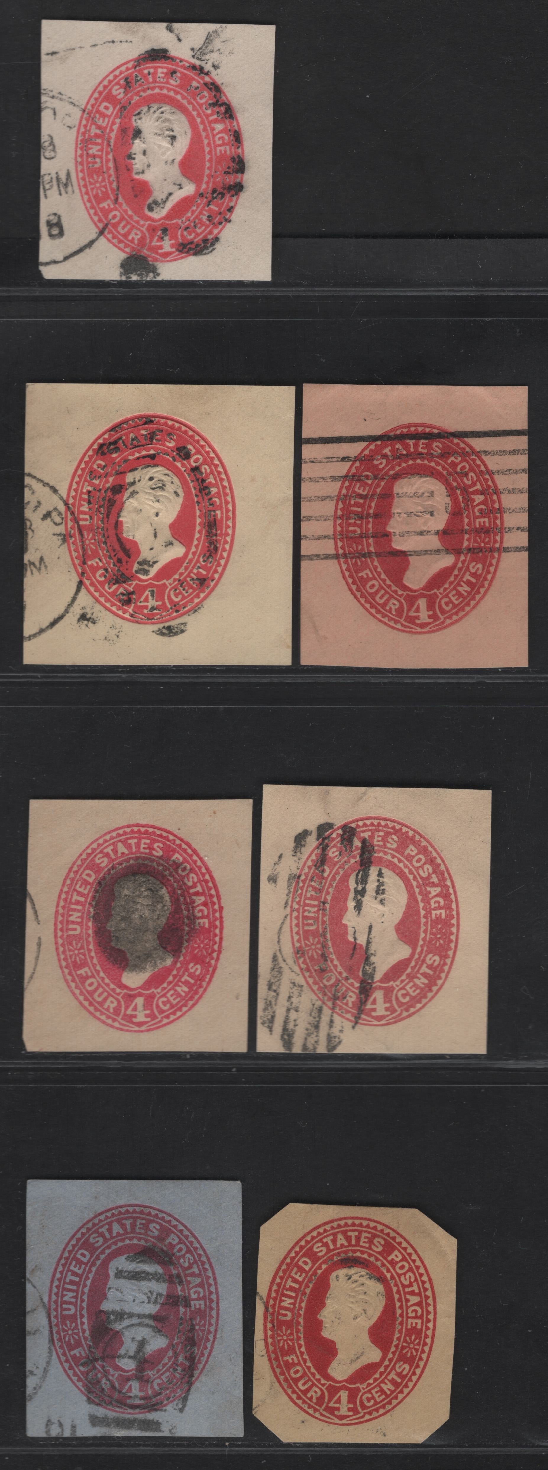 Lot 58 United States SC#U324b, U326a, U325, U328, U328b, U329a, U327 4c Scarlet, Lake, Pink & Carmine Jackson, 1887-1894 Heads Issue, 7 Fine/Very Fine Used Singles, White, Oriental Buff, Amber Manilla & Blue