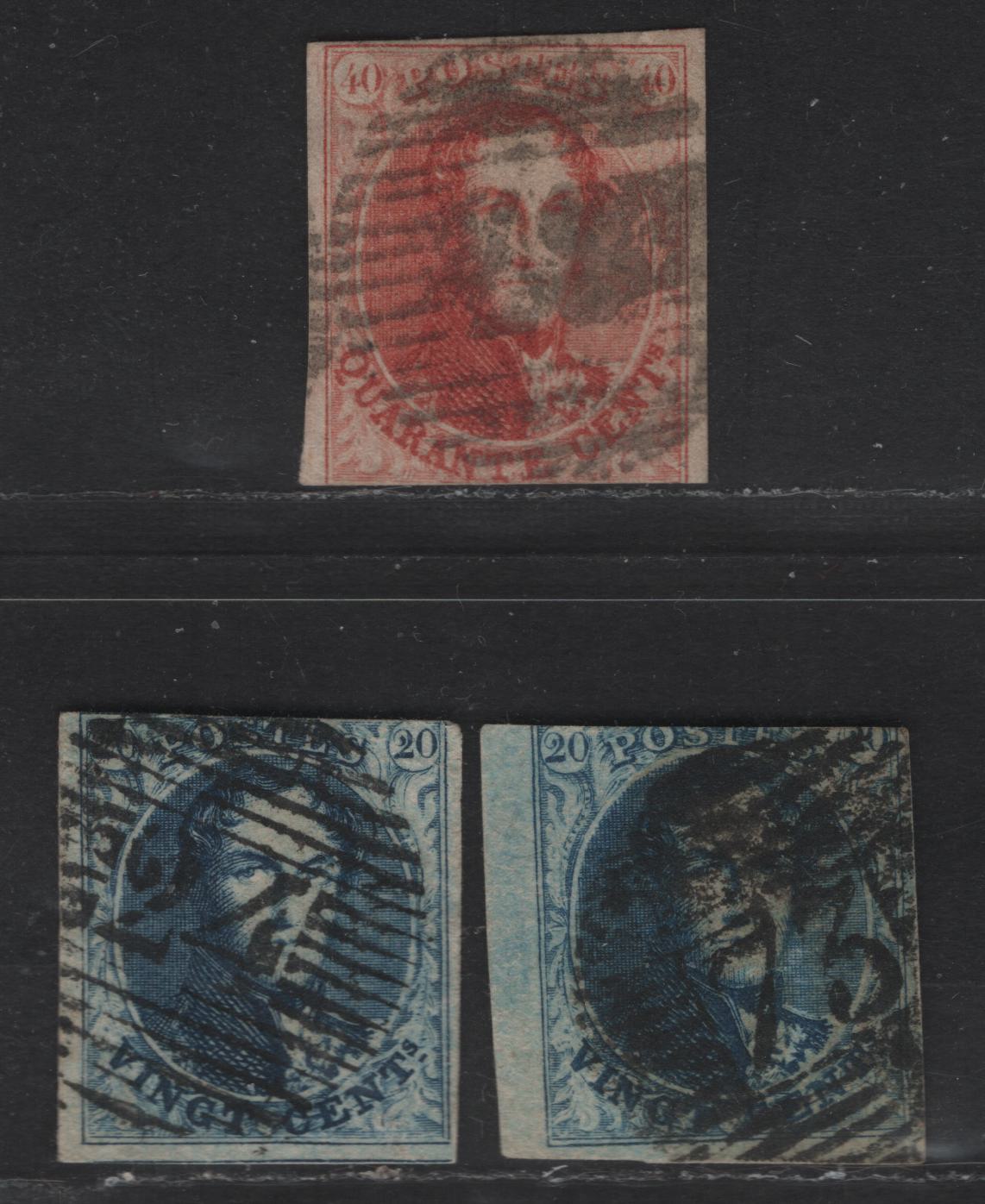 Lot 6 Belgium SC#7, 7b, 8b 20c & 40c Blue - Carmine Rose Leopold I, 1851-1854 Leopold I Issue, 3 Very Good/Fine Used Imperf Singles, Thick & Medium Wove Papers, Sound Examples