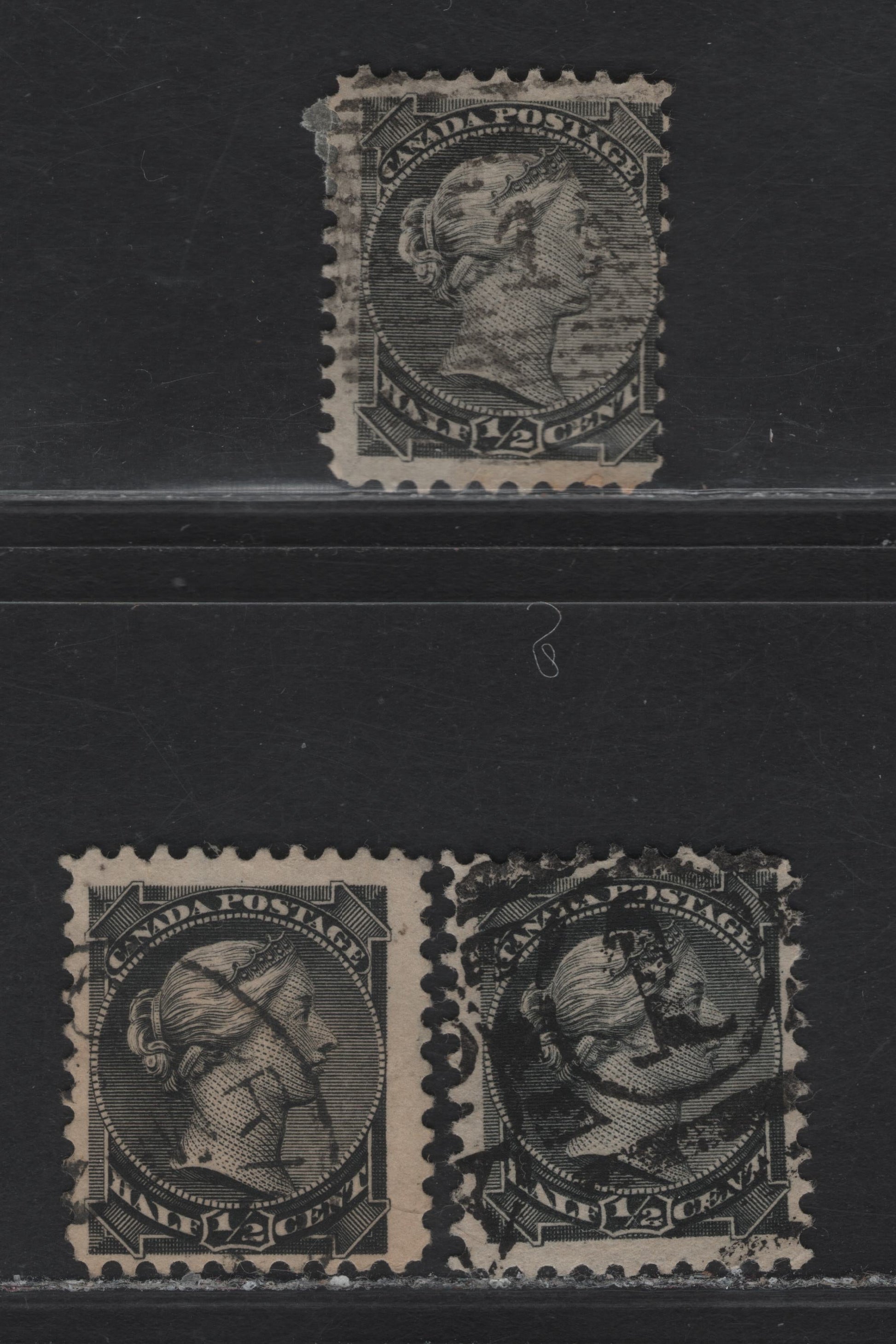 Lot 6 (C) Canada #34, 34i 1/2c Black & Gray Black Queen Victoria, 1870-1893 Small Queen Issue, 3 Good/Fine Used Singles, Papers 2O-MM, 2O-I & 2O-NN, Perfs 12x12.1 (Black) & 12 (Black & Gray Black)