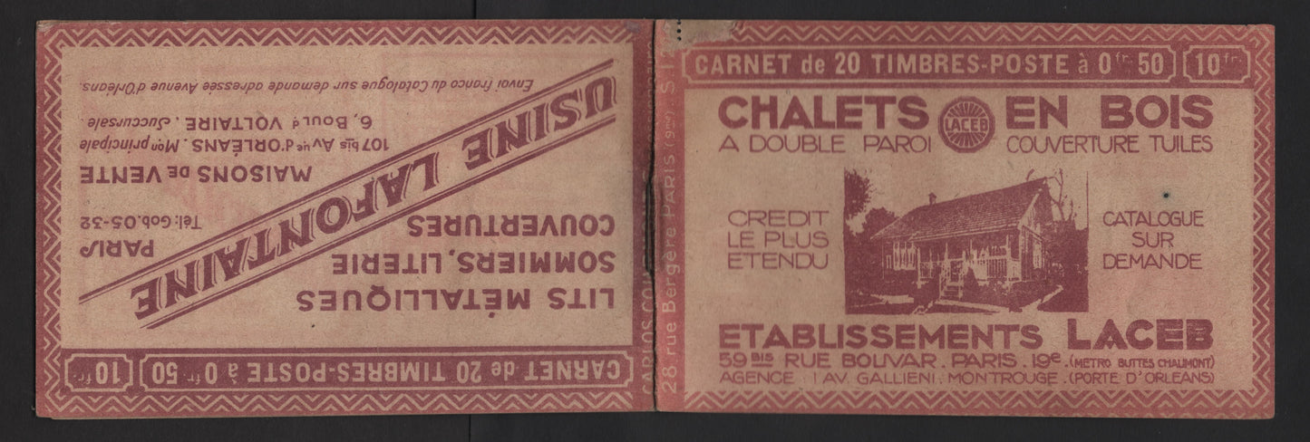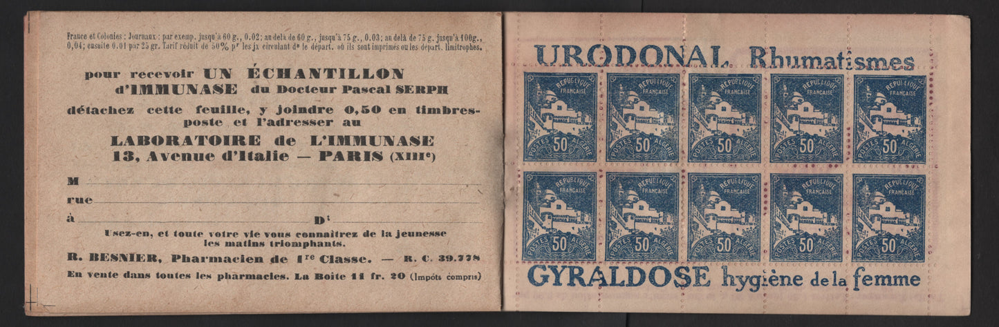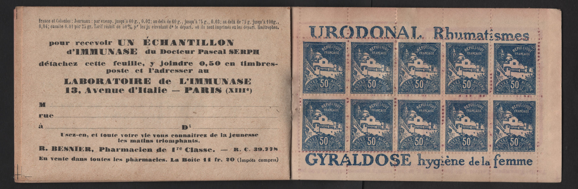 A very fine disturbed gum complete booklet of 20 of the 50c blue La Pecherie Mosque from the 1926-1939 Pictorial Definitives, two stuck down panes of 10, interleaving pages, scarce.