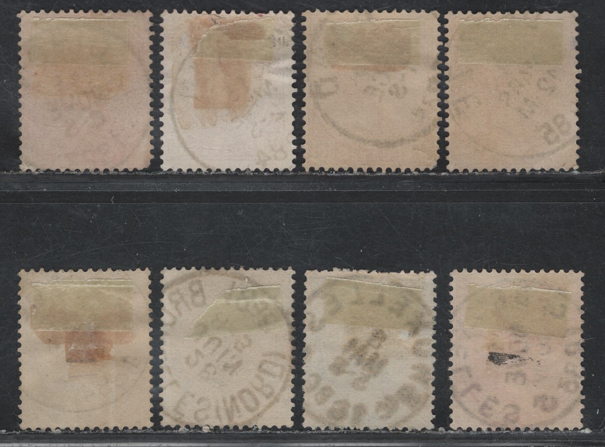 8 VG-VF Used singles of the 10c carmine, carmine rose, 20c grey & slate grey from the 1883 King Leopold I Sidefaces Issue SON cancels incl. Deynze, Libin, Dison, Liege & Brussels. One 20c has a vertical crease -10pts