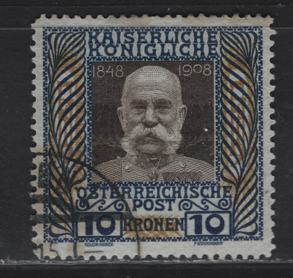 Lot 65 Austria SC#127 10k Blue, Bistre & Deep Brown Franz Josef, 1908 Royal Family Issue, A Very Fine Used Single