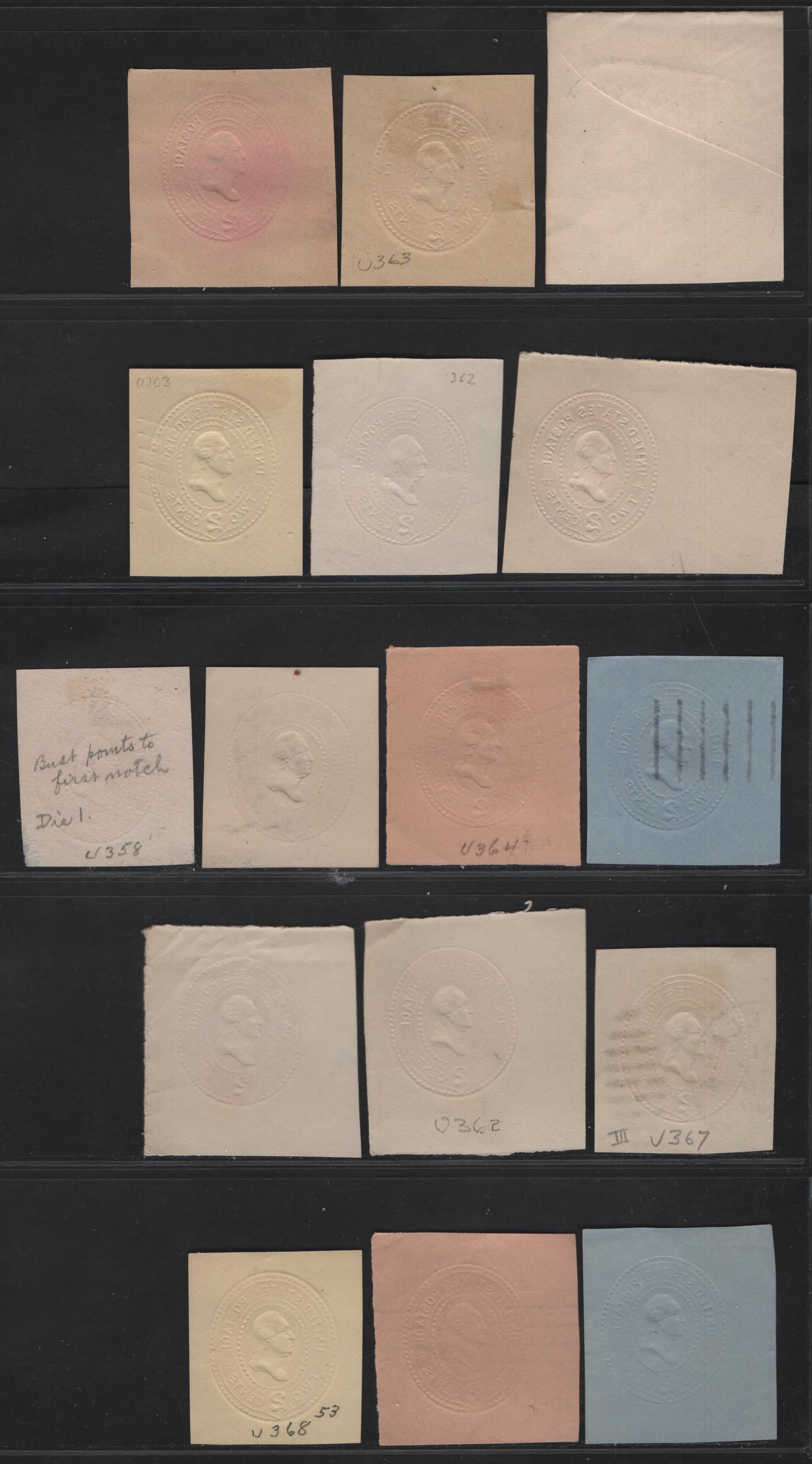 Lot 66 United States SC#U358, U362-U363, W366, U364-U365, U367-U370 2c Carmine & Rose Washington, 1899 Heads Issue, 16 Fine/Very Fine Used Singles, Dies 1-3, White, Manilla, Amber, White, Oriental Buff & Blue