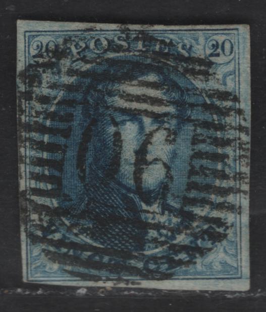 Lot 7 Belgium SC#11b 20c Blue Leopold I, 1858 Leopold I Issue, A Very Fine Used Imperf Single, Unwatermarked, 16.5mm Tall Oval, Full Margins, Though Close IN LL Corner, Moldeak #106 Numeral Cancel