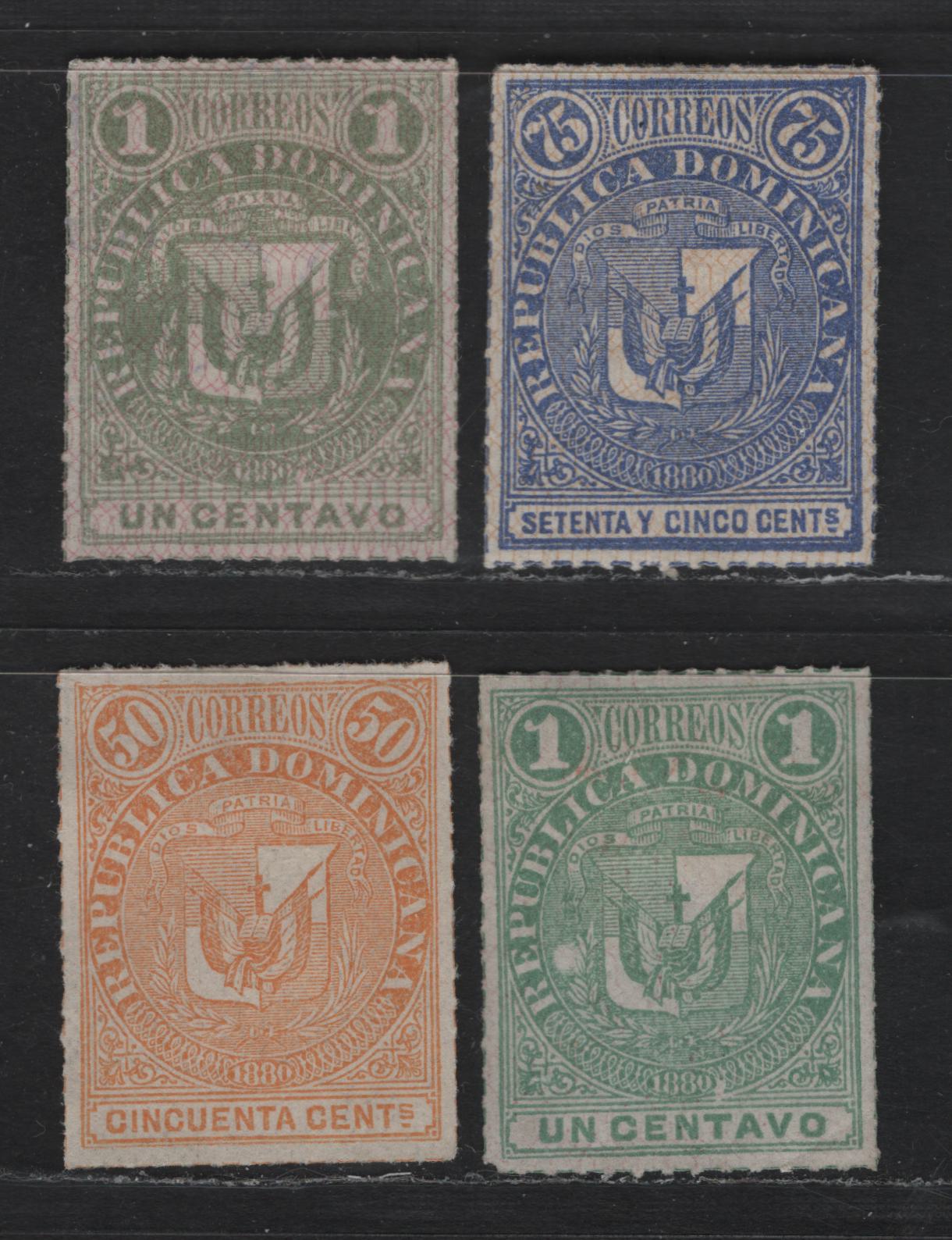 Lot 70 Dominican Republic SC#36, 42-43, 45 1c, 50c & 75c Green, Yellow & Ultramarine Arms, 1880-1881 Rouletted Arms Issues, 4 F/VFOG & Unused Singles, With & Without Network, Small Hinge Thin On 75c, 50c & 1c (#45) No Gum