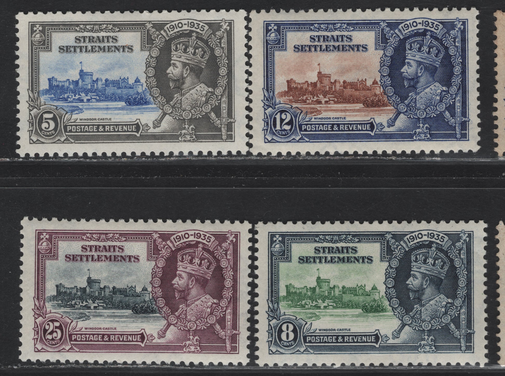 Lot 71 Straits Settlements SG#256-259 5c - 25c Ultramarine & Gray - Slate & Purple KGV & Windsor Castle, 1935 Silver Jubilee Issue, 4 VFOG Singles, Hinged Set
