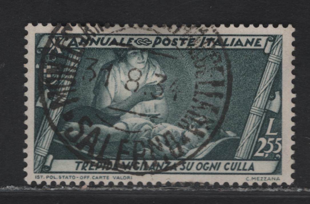 A very fine used single of the 2.55l dark gray Mother & Child from the 1932 10th Anniv of March on Rome Issue, august 31 1934 salerno cds cancel.