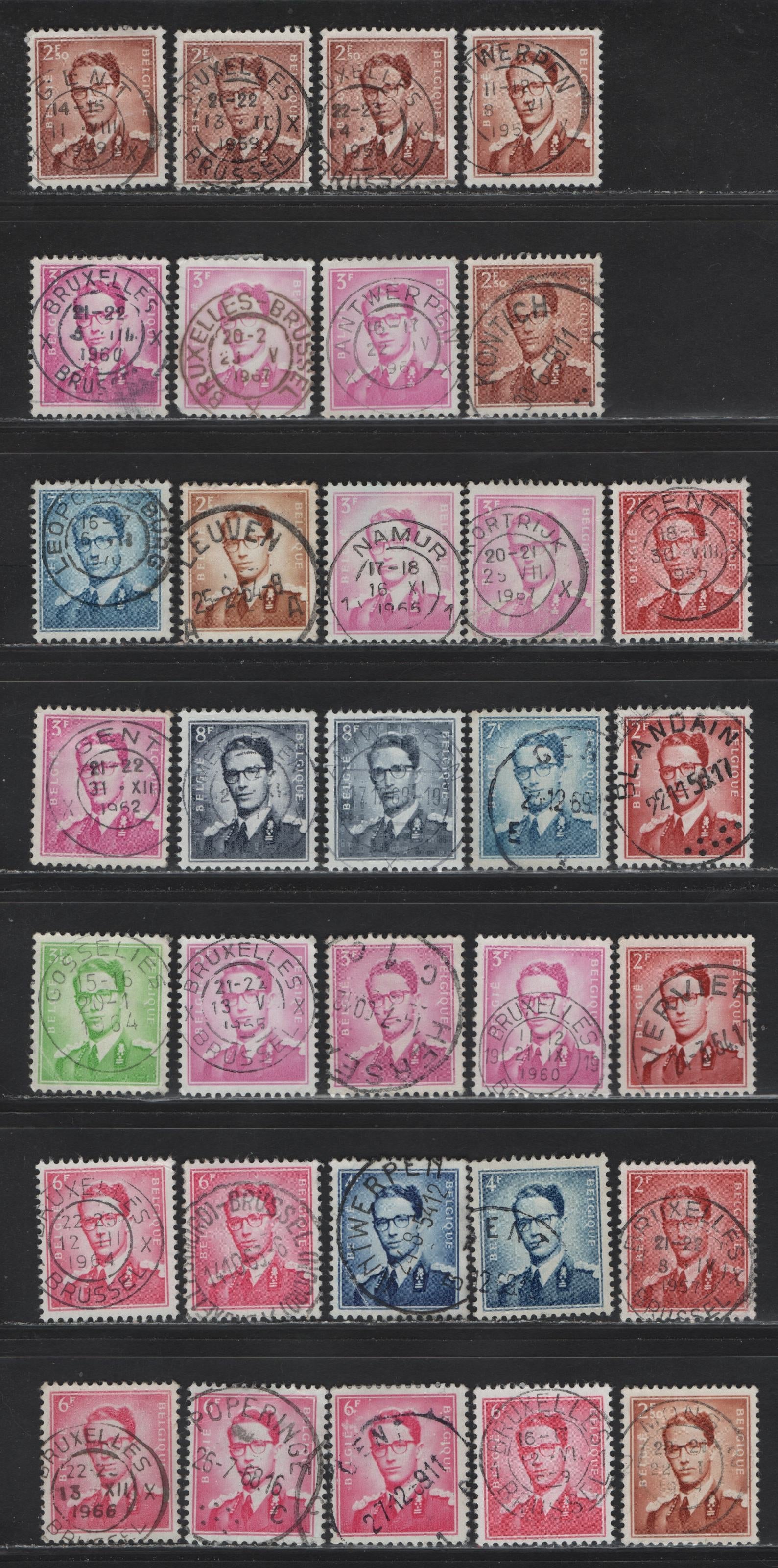 Lot 82 Belgium SC#452/464 2fr Rose Carmine - 5fr Bluish Grey, 1953-1972 King Baudouin Definitive Issue, 33 VF Used Singles All With SON Town Cancels, Different Printings And Shades
