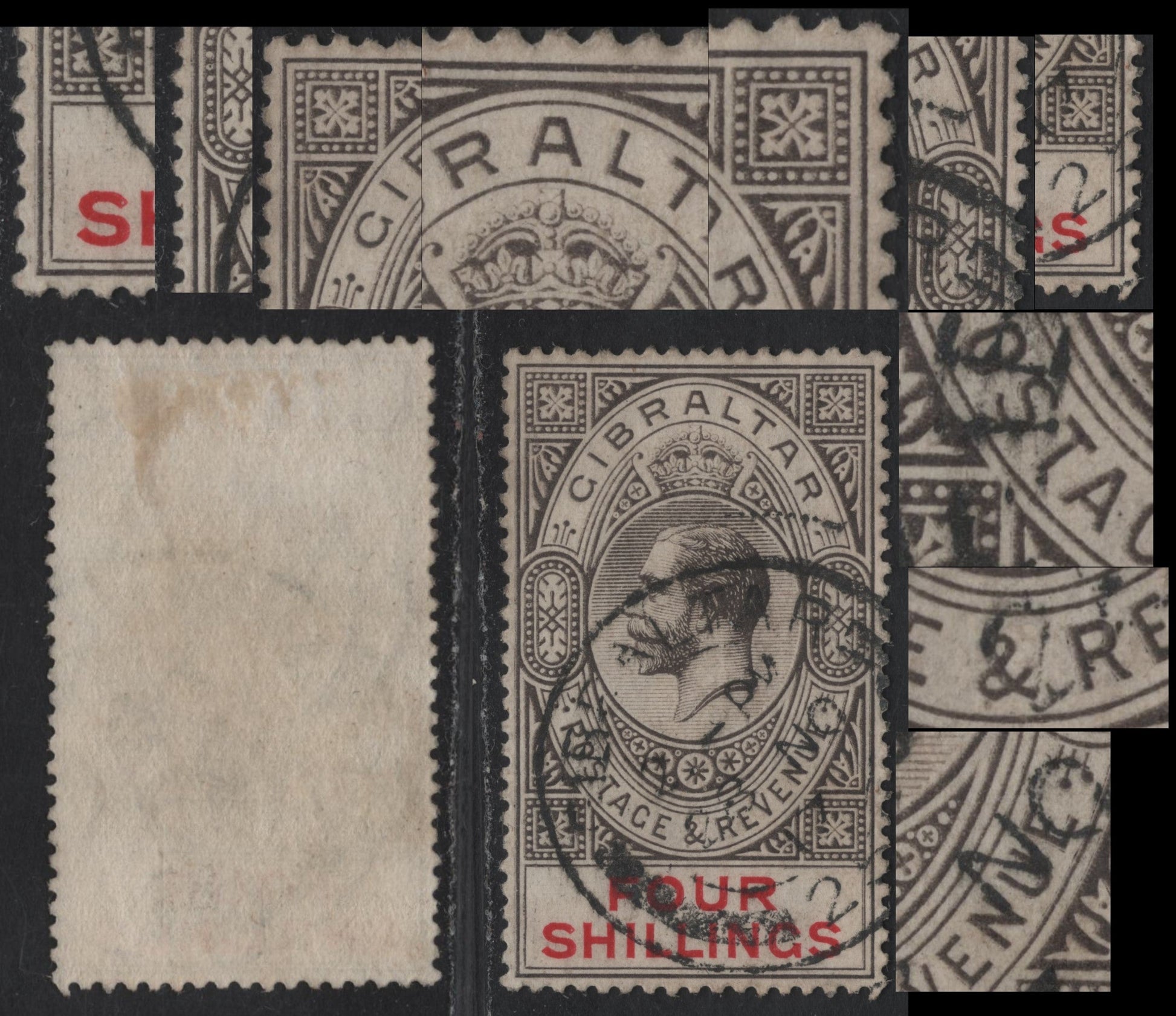 Lot 85 (C) Gibraltar SG#83 4/- Gray Black & Carmine King George V, 1912-1924 KGV Keyplates, A Very Fine Used Single, Double Print of Entire Head Plate