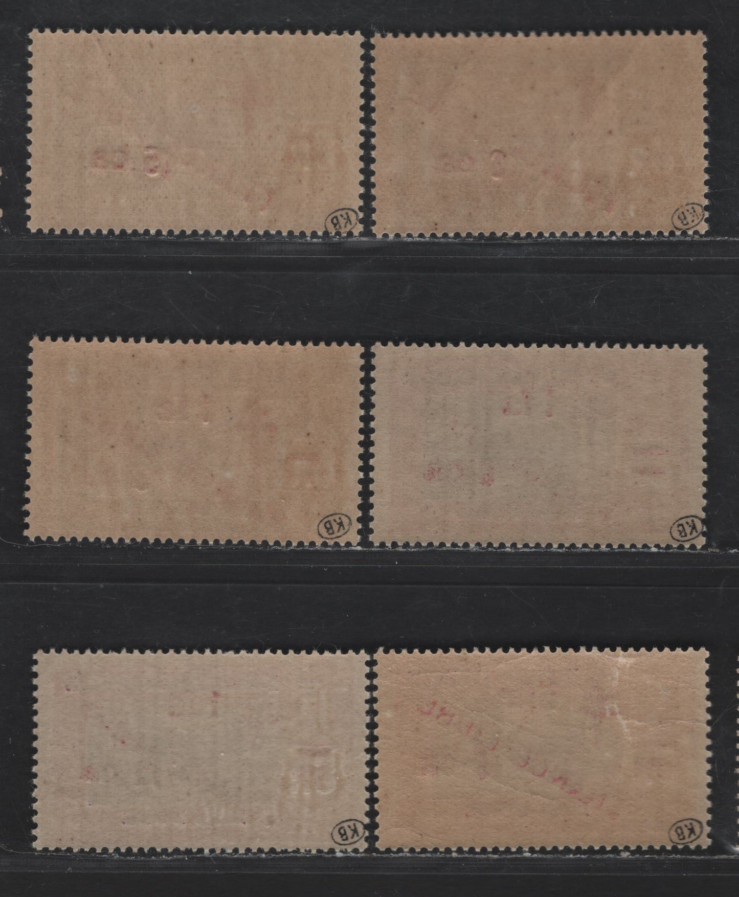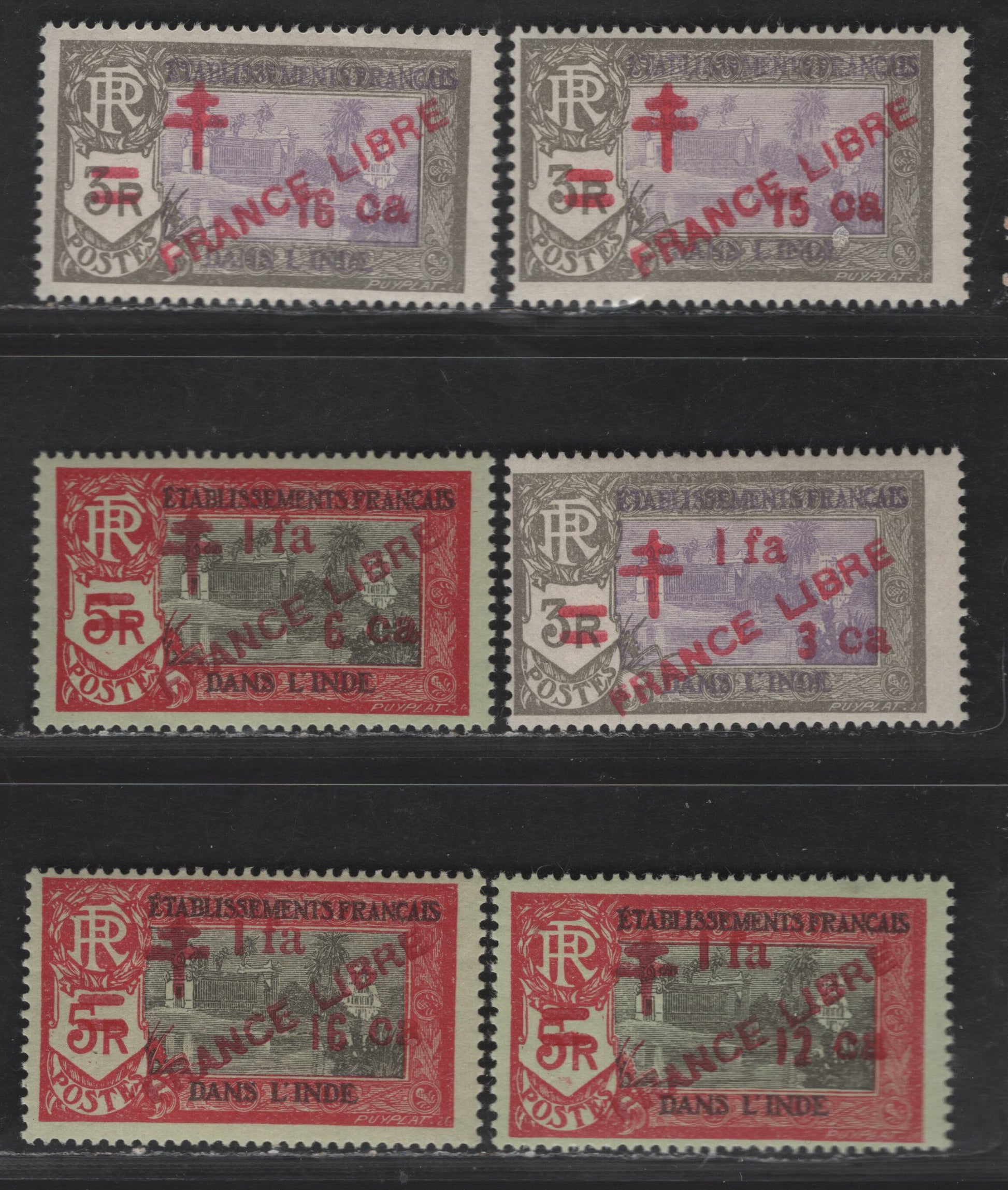 Lot 88 French India SC#204-209 15c on 3r - 1fa16c Gray & Violet - Black & Carmine on Greenish Brahma, 1943 France Libre Overprints & Surcharges, 6 F/VFOH/NH Singles