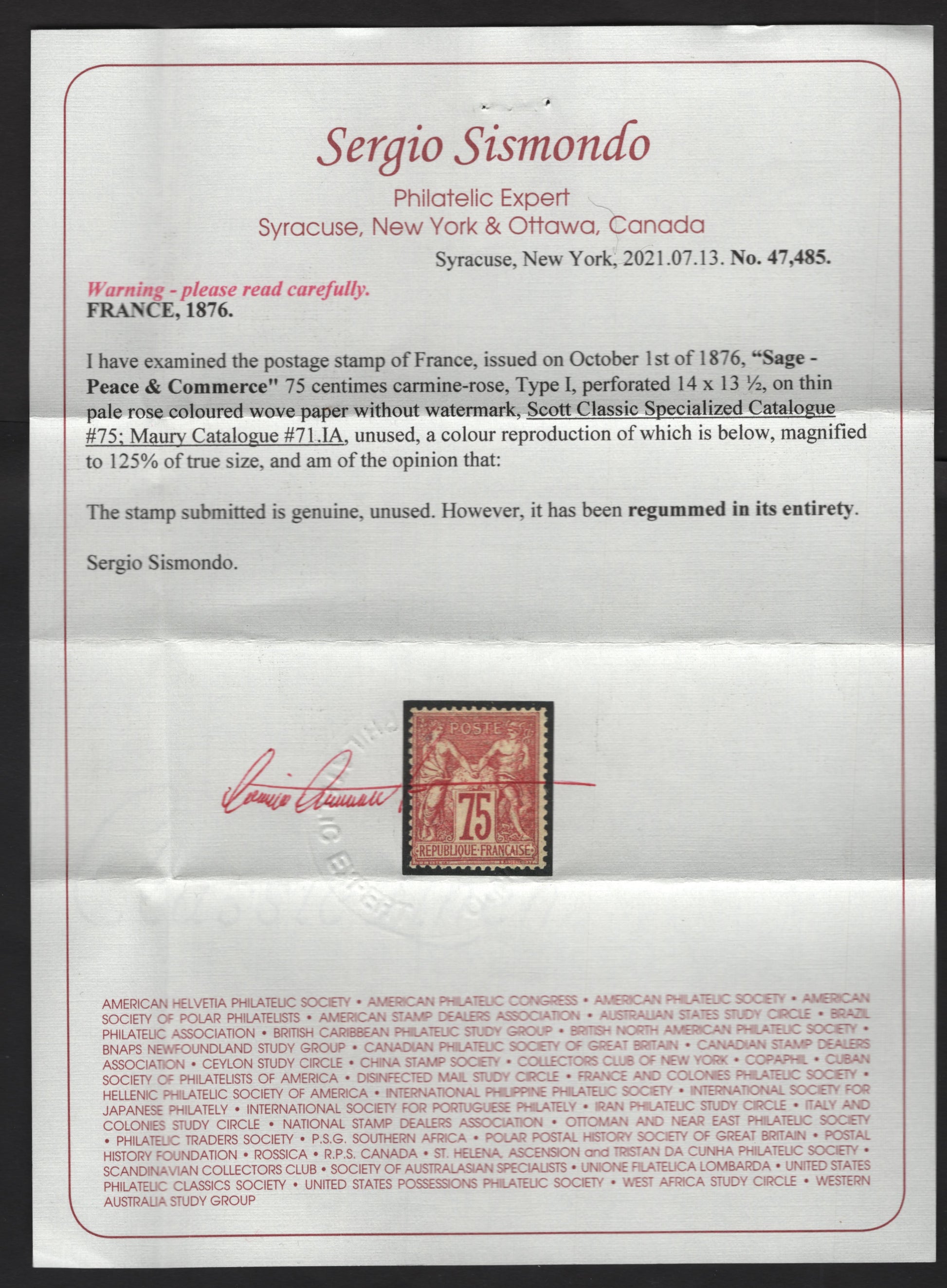 Lot 9 France #75 75c Carmine Rose Peace & Commerce, 1876-1878 Peace & Commerce, A Fine Regummed Single, Type I, Sismondo Certificate Stating That It Is Regummed