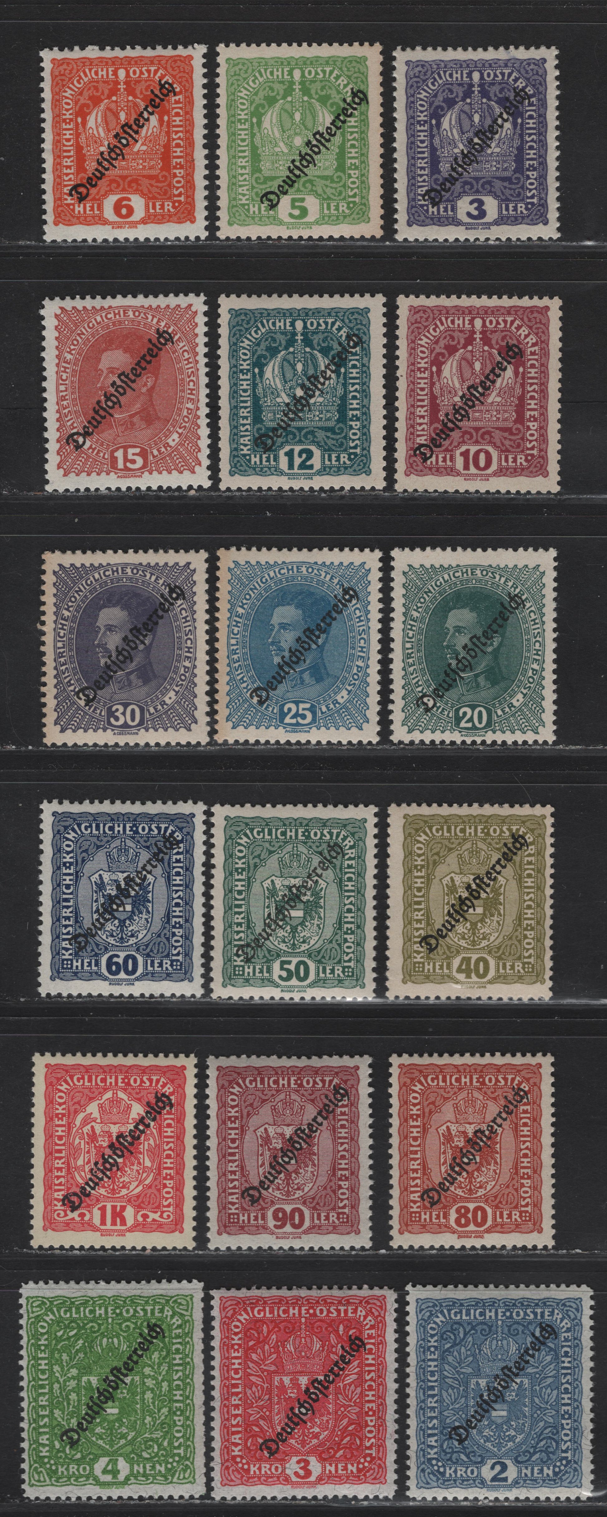 Lot 91 Austria SC#181-198 3h - 4k Bright Violet - Yellow Green Coat of Arms, 1918-1919 New Republic Overprinted Issue, 18 F/VFNH Singles, Short Set to 4k, Nearly All VF & NH