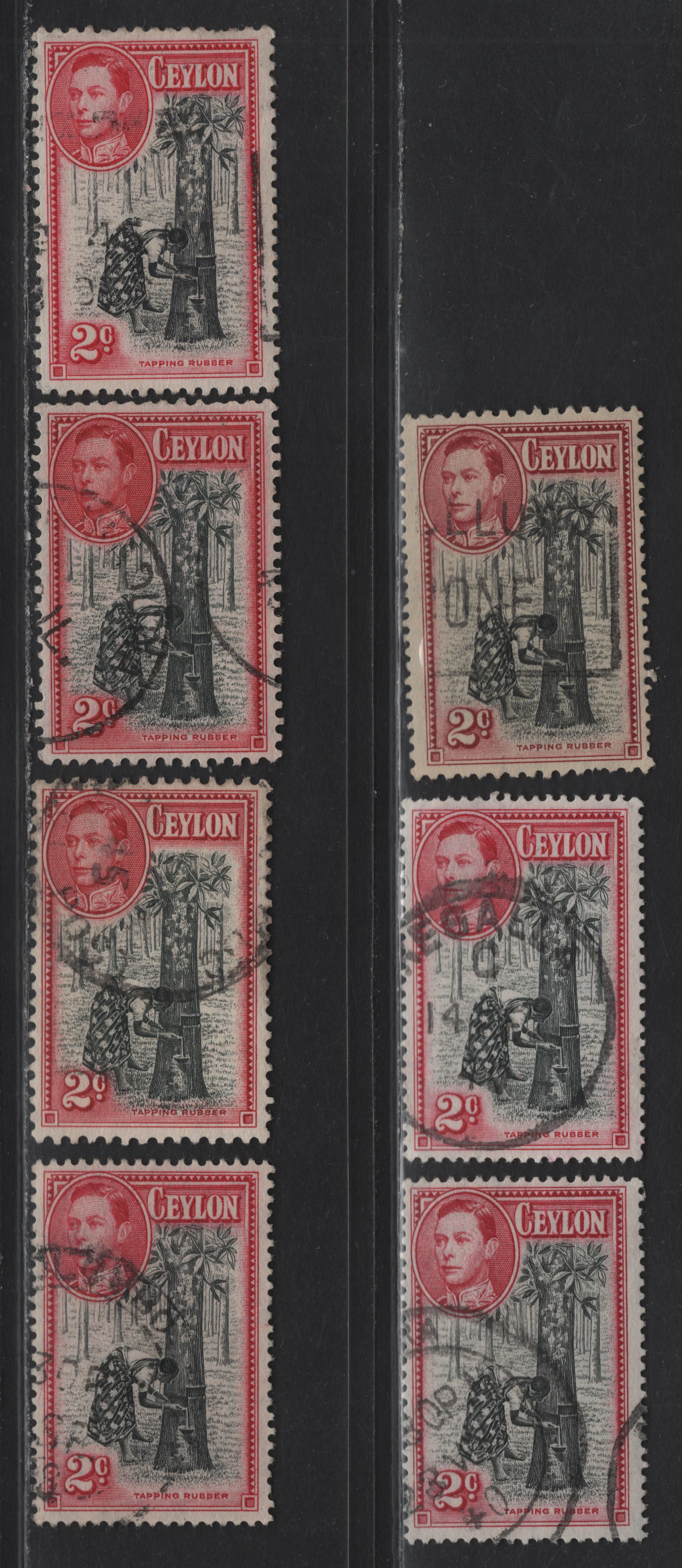 Lot 93 Ceylon SG#386-386d 2c Black & Carmine Tapping Rubber, 1938-1941 KGVI Pictorial & Surcharged Issues, 7 Very Fine Used Singles, Complete Used Group of All The Listed Perfs, 2 Shades Of Perf 13.5 & 11x11.5 Printings