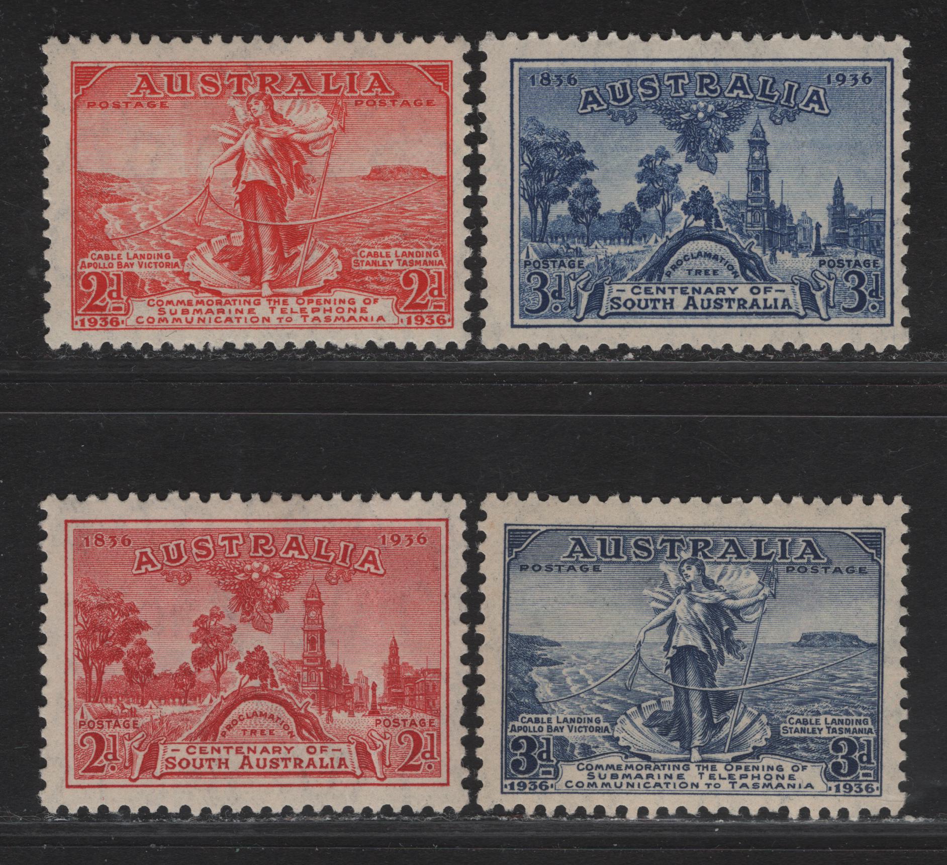 4 F/VFOG/NH singles of the 2d - 3d scarlet - blue Amphitrite & Telephone Cable - Site of Adelaide from the 1936-1936 Opening Of Submarine Telephone Link - Centenary of South Australia Issues, 2d South Australia has 2 spots of gum disturbance.