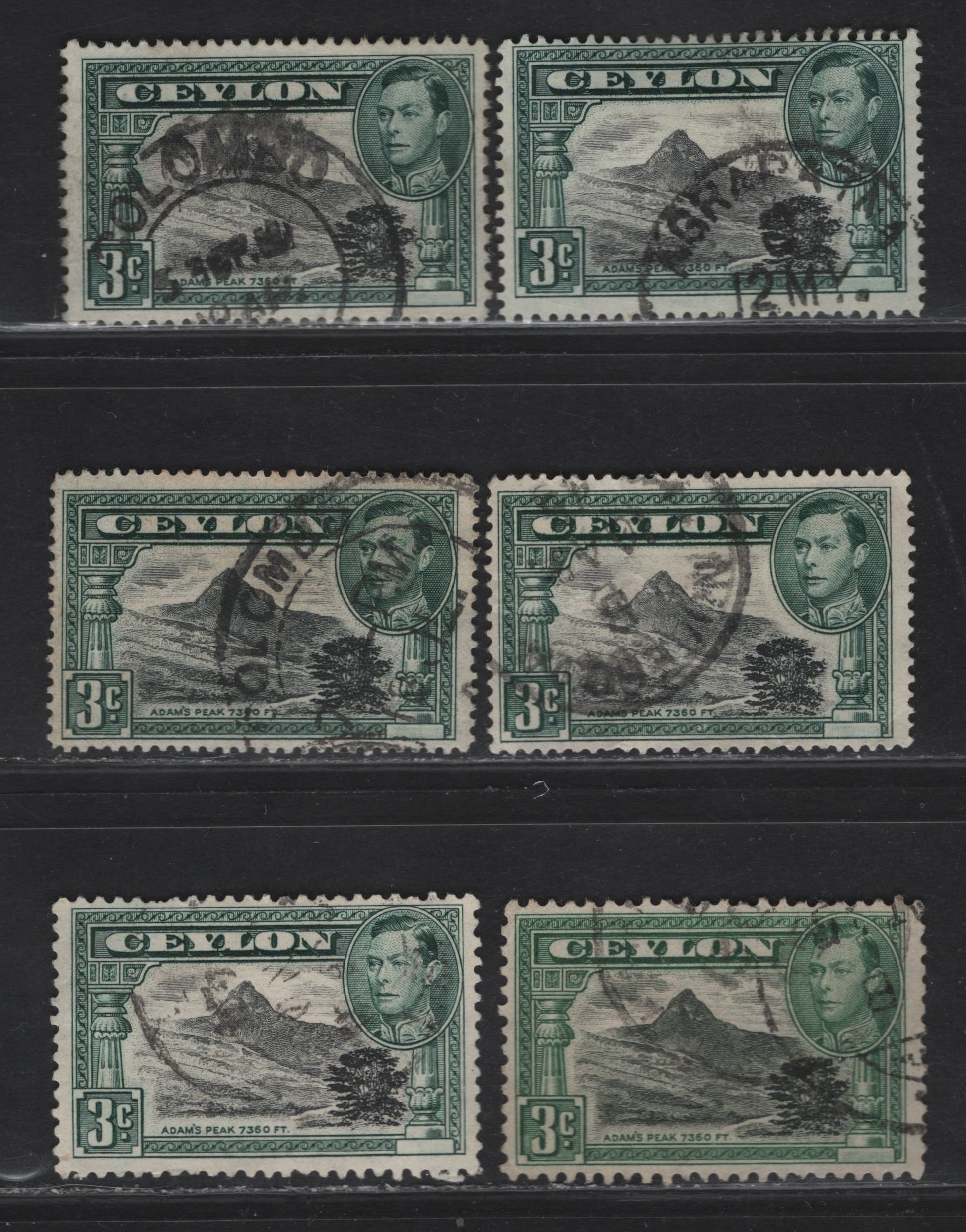6 fine used singles of the 3c black & deep blue green Adam's Peak from the 1938-1941 KGVI Pictorial & Surcharged Issues, full set of all perfs listed in gibbons.