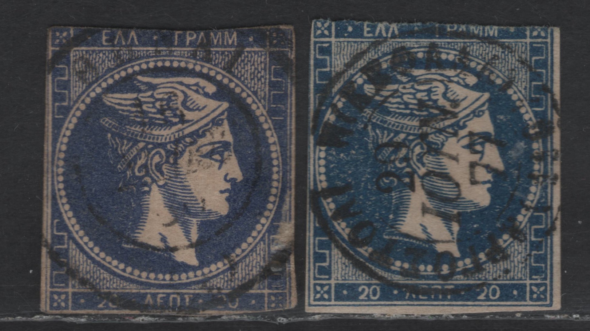 2 ungraded singles of the 20l ultramarine & blue Hermes Head from the 1870-1872 Large Hermes Heads Issue, cream paper, reference examples with small to no margins or faults, like creases.