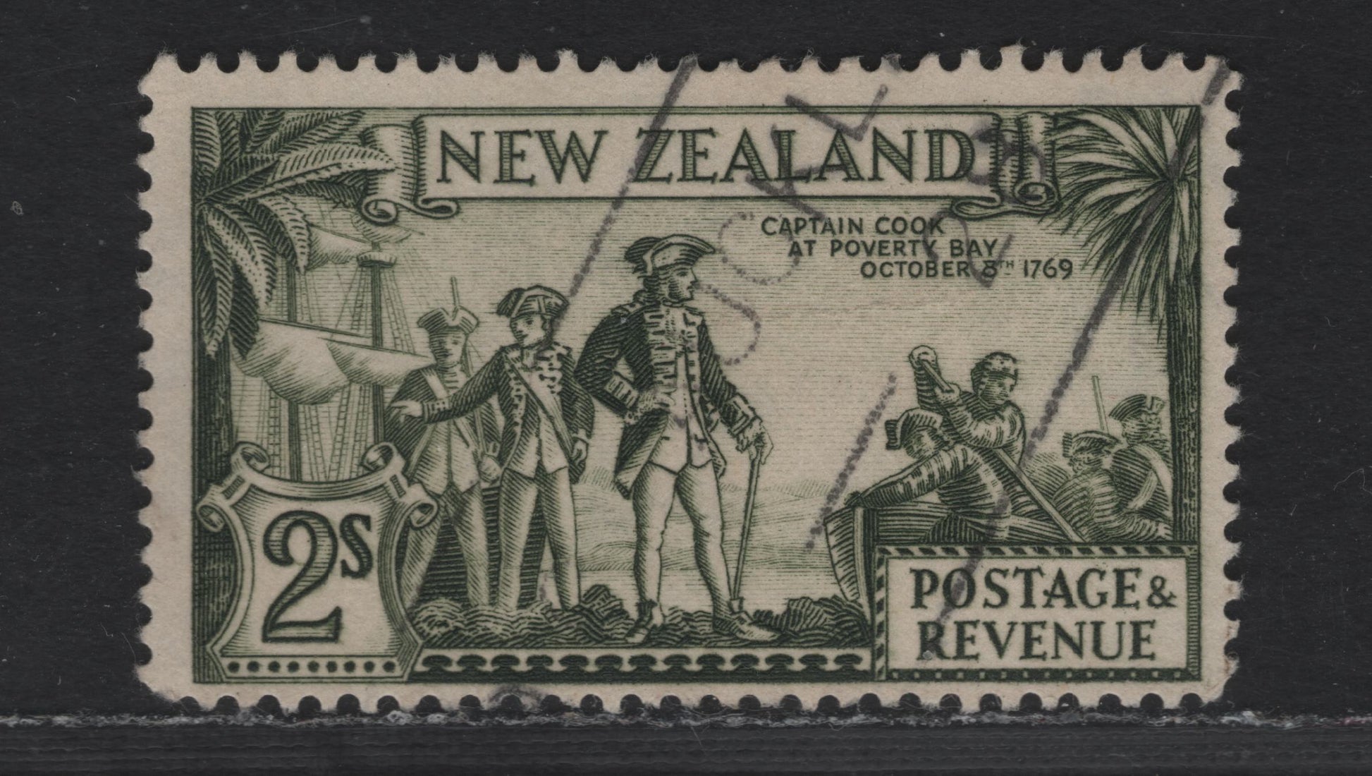 New Zealand SG#568c 2/- Olive Green Capt. Cook, 1935-1936 Pictorial Issue, A Fine Used Single, Perf 13.5x14, Single Wmk