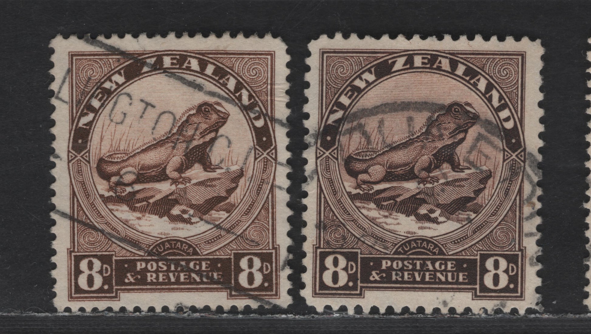New Zealand SG#586b-c 8d Chocolate & Sepia Tuatara Lizard, 1936-1942 Pictorial Issue, 2 Very Fine Used Singles, Perfs 14x13.5 & 12.5