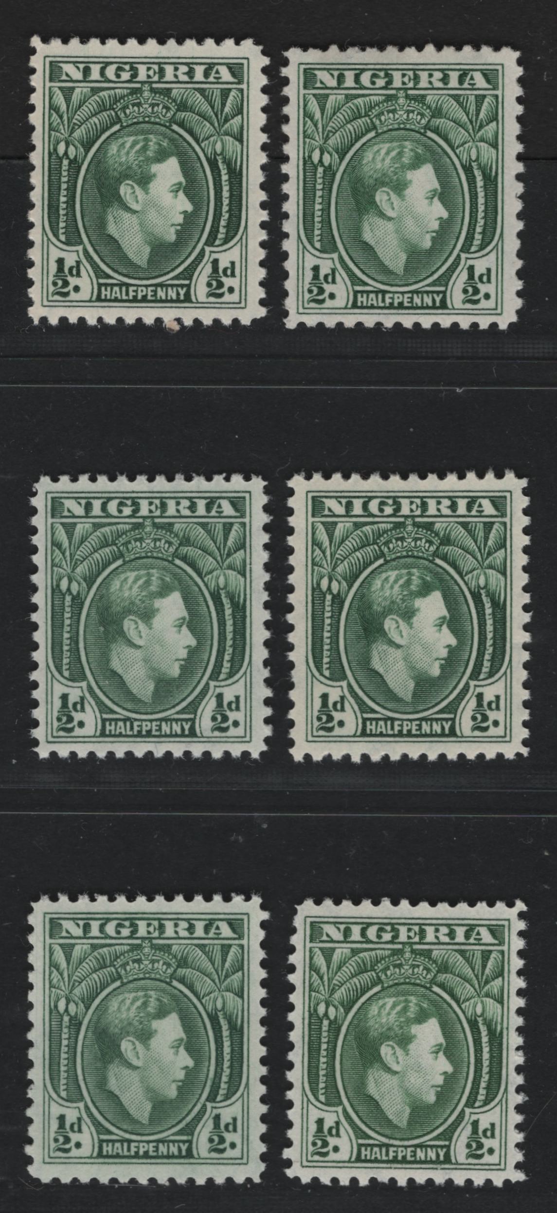 Nigeria #53var (SG#49var) 1/2d Deep Dull Green - Dull Green King George VI, 1938-1952 King George VI Definitive Issue, 6 VFOG & VFNH Singles, Line Perf 12, April 1944, December 1944, March 1945 & July 1947 Printings