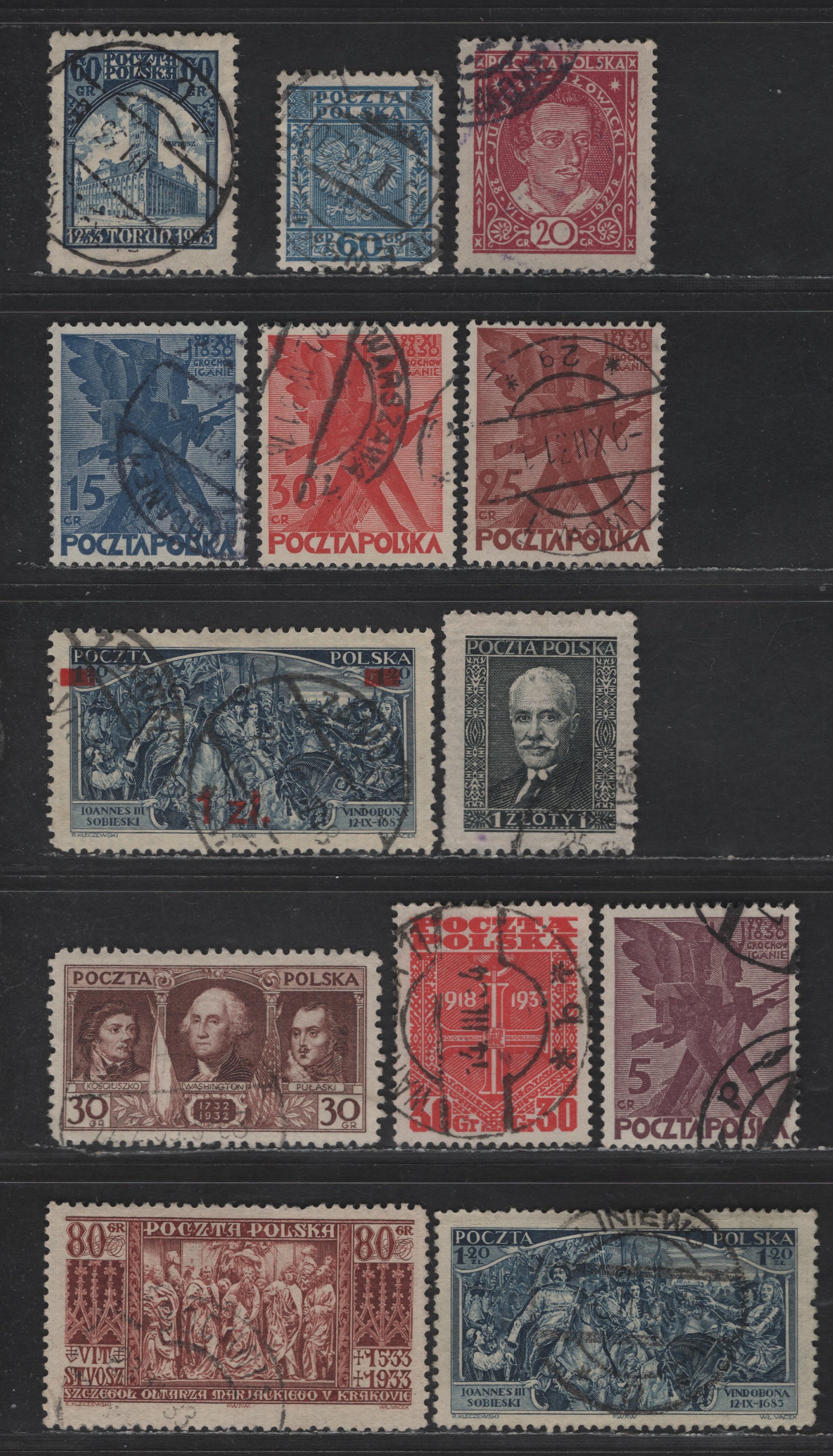 Poland SC#249, 255a, 263-267, 274, 277-279, 286 20g - 1x on 1.20z Rose - Indigo Juliusz Slowacki - John III Sobieski, 1927-1934 Juliusz Slowacki - John III Sobieski Issues, 12 Fine/Very Fine Used Singles