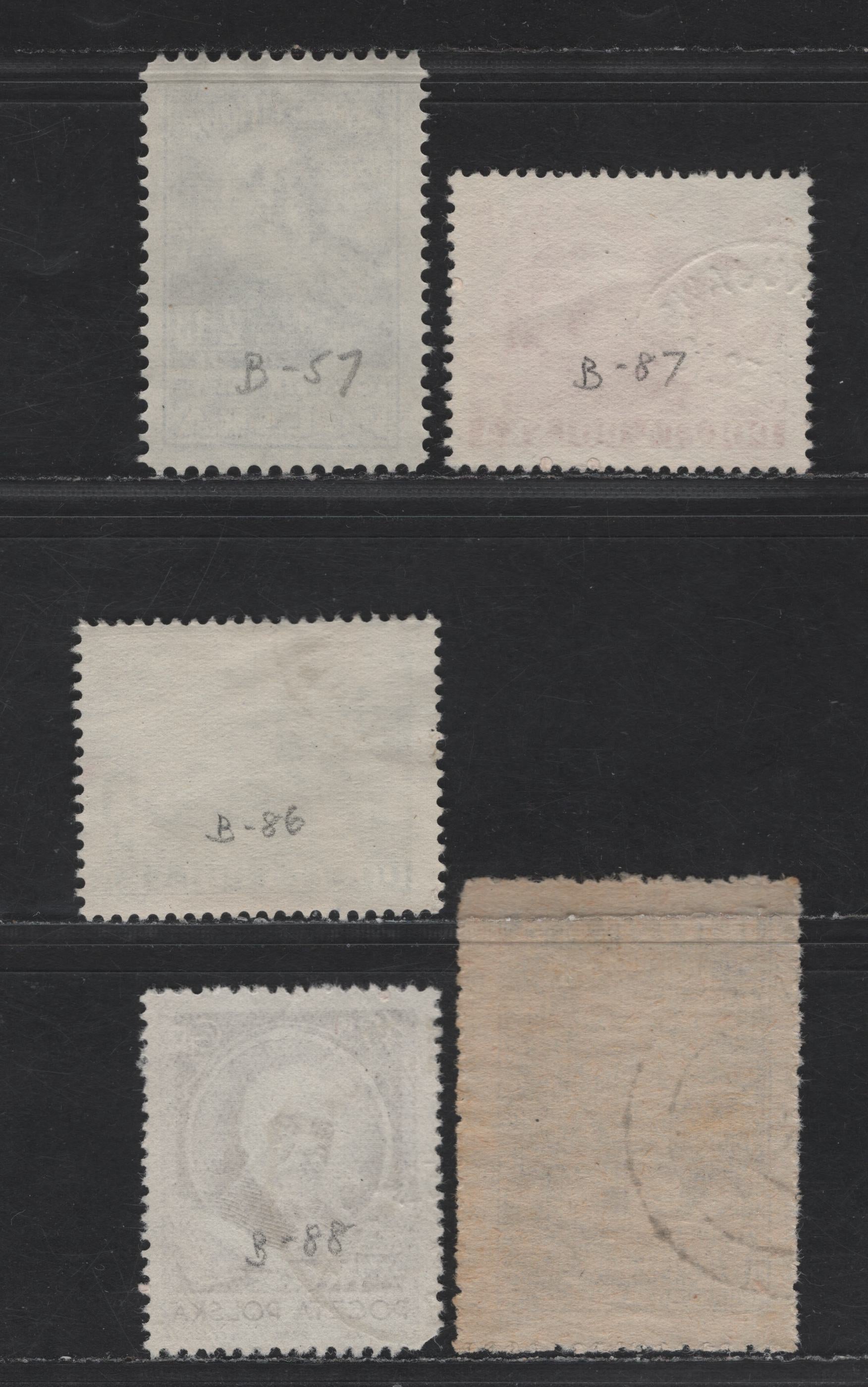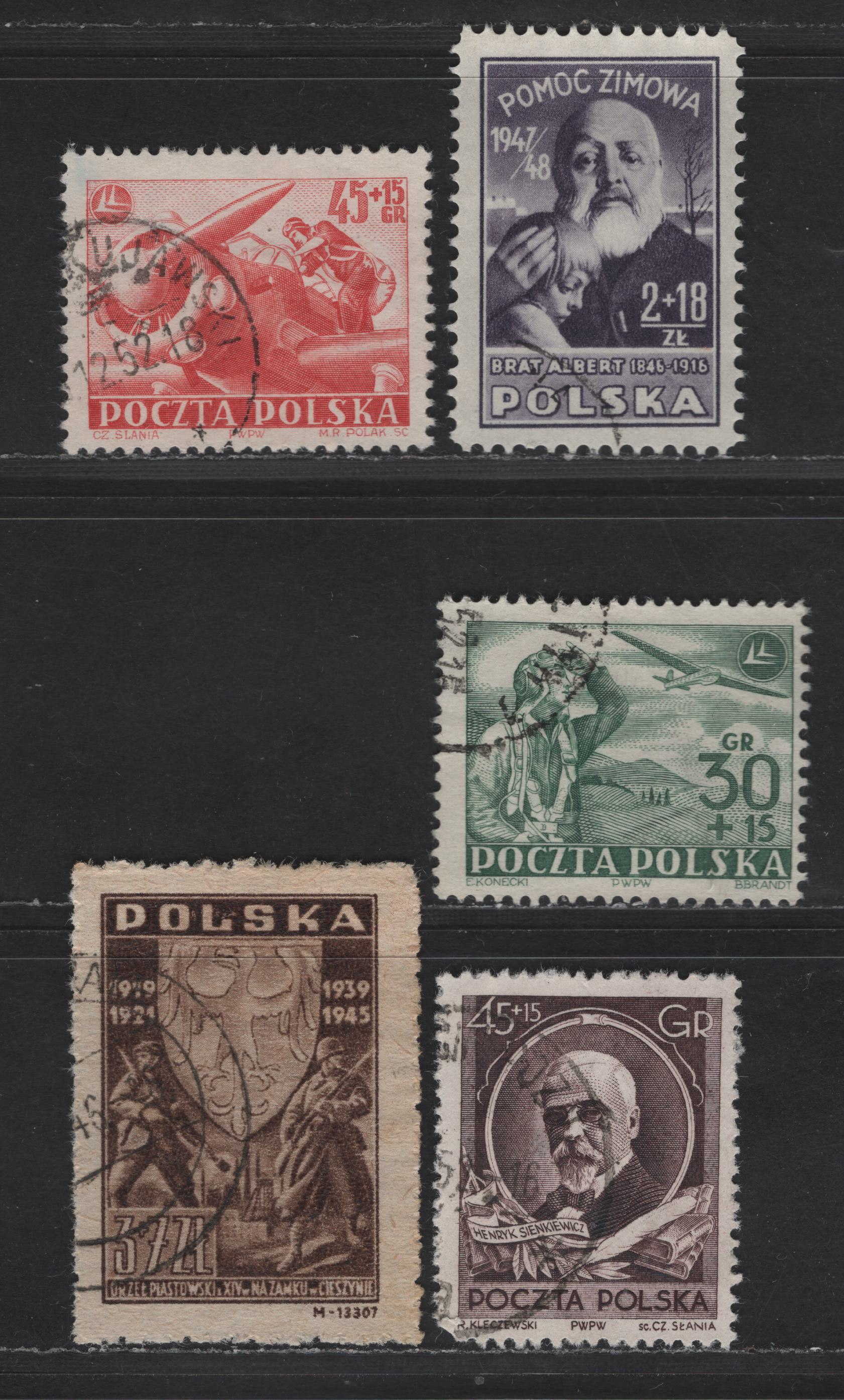 Poland SC#B44, B57, B73, B86-B88 3z+7z - 45g+15g Brown - Violet Brown 14th Century Piast Eagle & Soldiers - Henryk Sienkiewicz, 1946-1952 Semi Postal Issues, 6 Fine/Very Fine Used Singles,