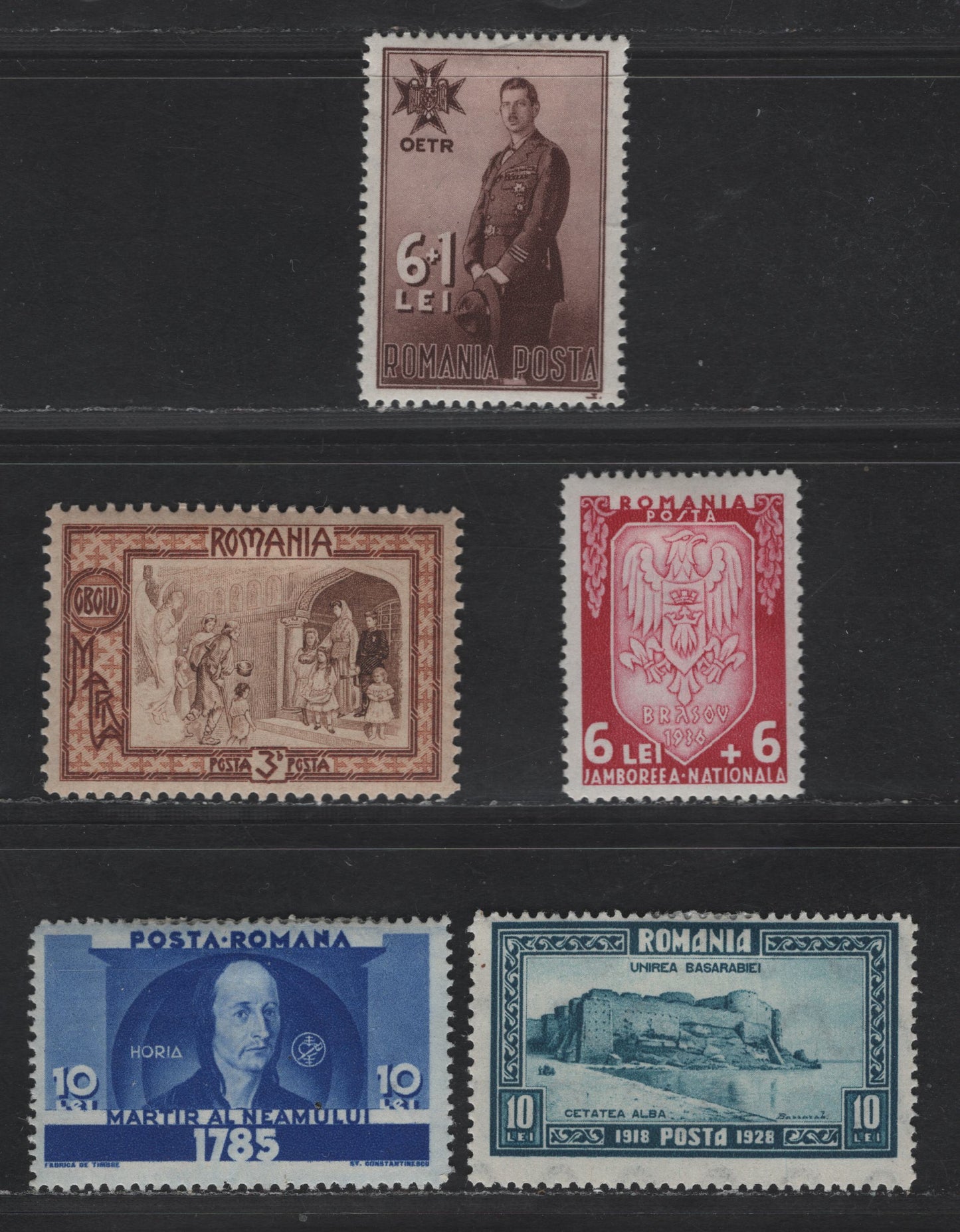 Lot 180 Romania SC#70-80 10i - 6i+6i Prussian Blue - Carmine Rose Parliament House - Jamboree Emblem, 1928 -1936 Reunion of Bessarabia & Romania - Semi Postal Issues, 5 F/VFOG Singles ,