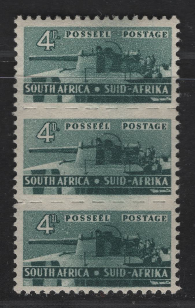 Lot 166 South Africa SC#95 4d Dark Green Artillery, 1942-1943 War Issues, A VFOG Strip Of 3, Perf15x14, Roulette 6.5 Between, Wmk 201